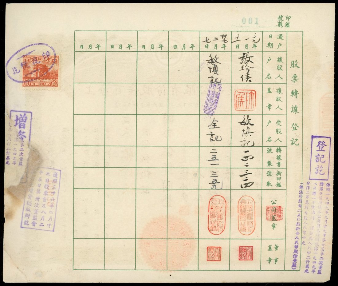 Shanghai Bai Jia Company Limited, a certificate of 500 shares, 1944, number 29, green ornate border, red seal, revenue stamp at top left on reverse,