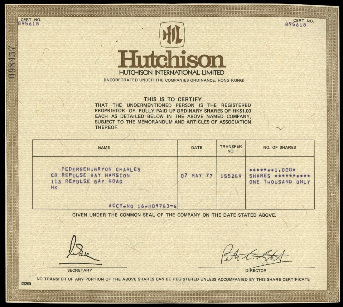 Hutchison International Limited, a certificate of 1000 shares, 1977, number 895618, about uncirculated.