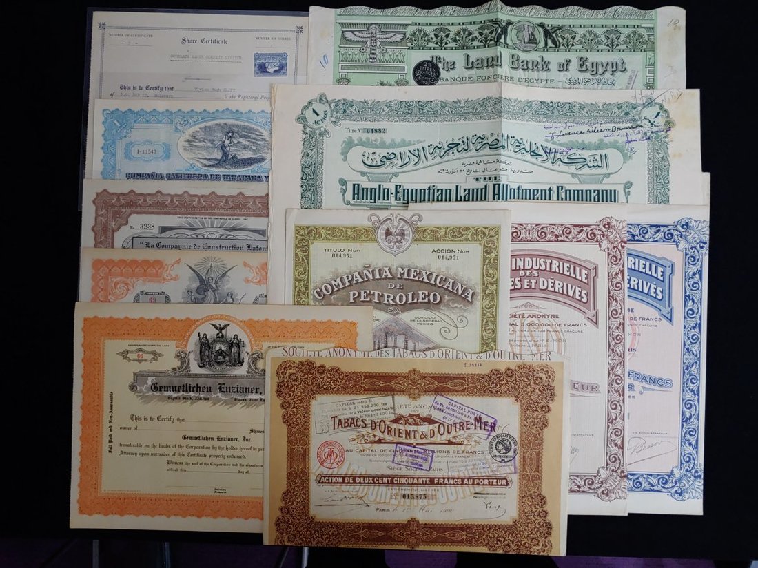 World Bonds, group of 11 bonds/shares from a range of various industries, mixed condition, generally about extremely fine (11)