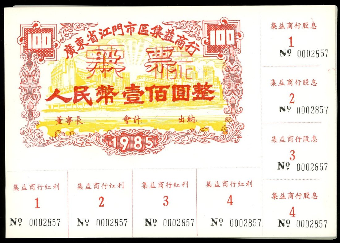 Ji Yi Company, Jiangmenshi, a lot of 57x renminbi 100 yuan share certificates, 1985, specimen, red and yellow, with numbered coupons,
