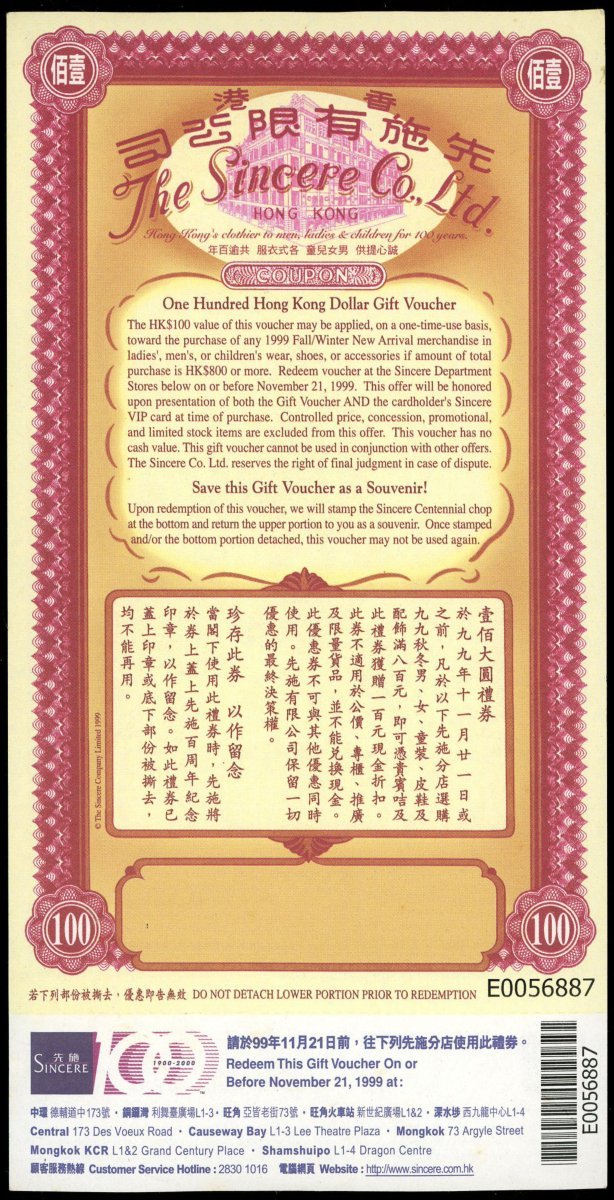 Hong Kong, Sincere Company Ltd., $100 gift voucher, 1999, well preserved