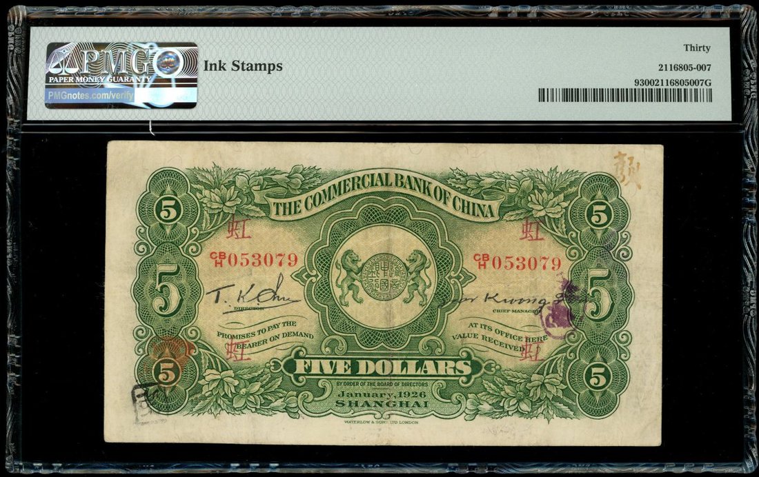 民國十五年(1926)中國通商銀行伍圓,編號CB/H 053079,PMG 30,有墨印