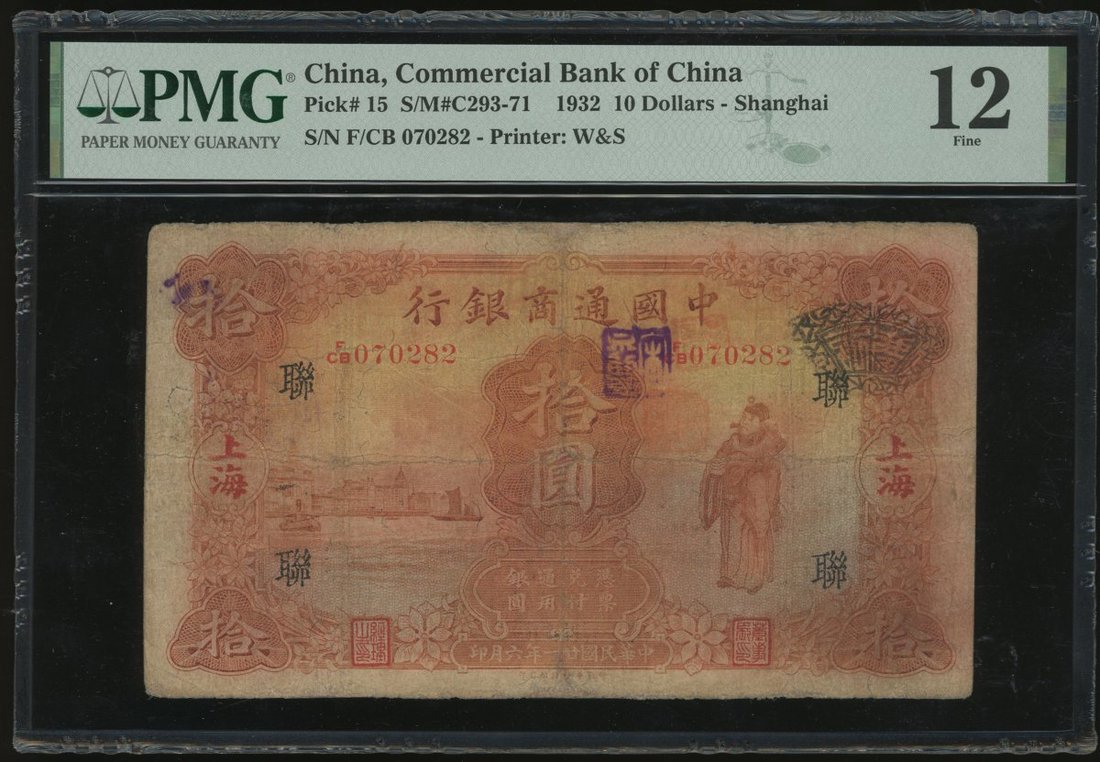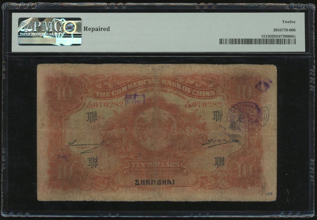 民國二十一年(1932)中國通商銀行拾圓,上海地名,編號F/CB 070282,PMG 12,有修補