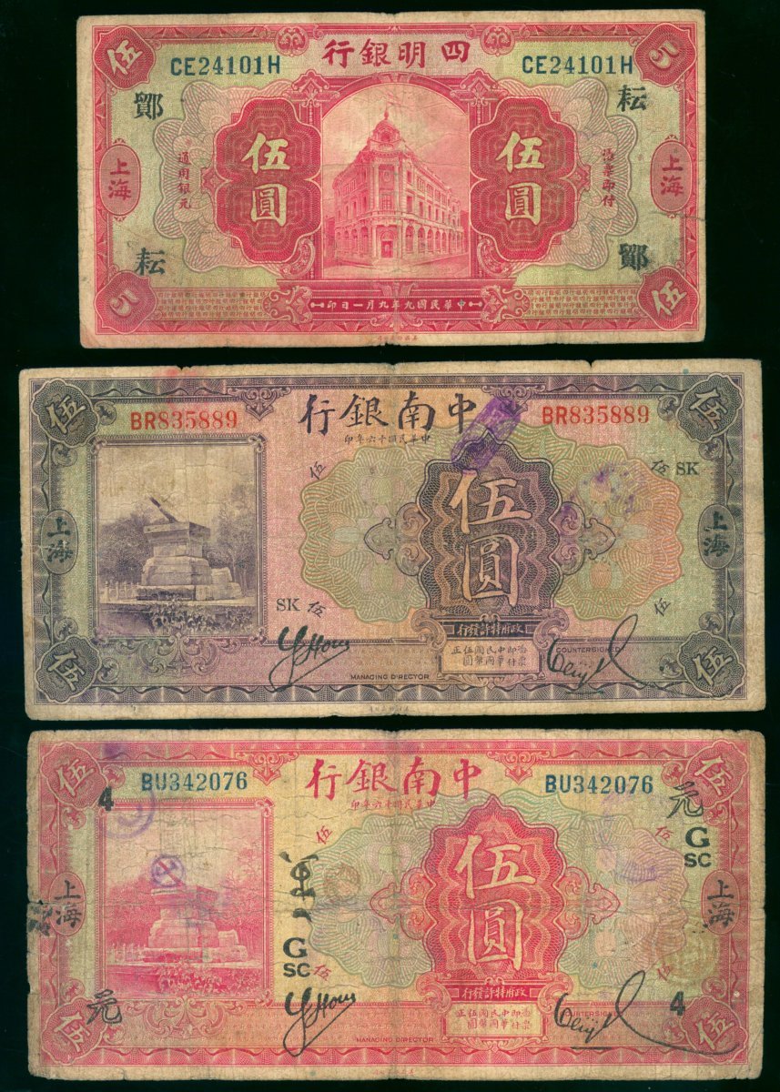 3.四明銀行3枚,包括民國十年及十四年上海地名1元,及民國九年上海地名5元
