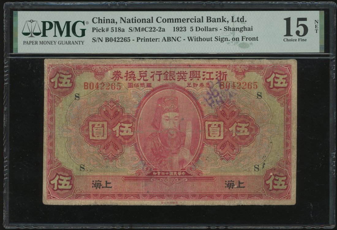 民國十二年(1923)浙江興業銀行兌換券伍圓,上海地名,編號B042265,PMG 15NET有修補