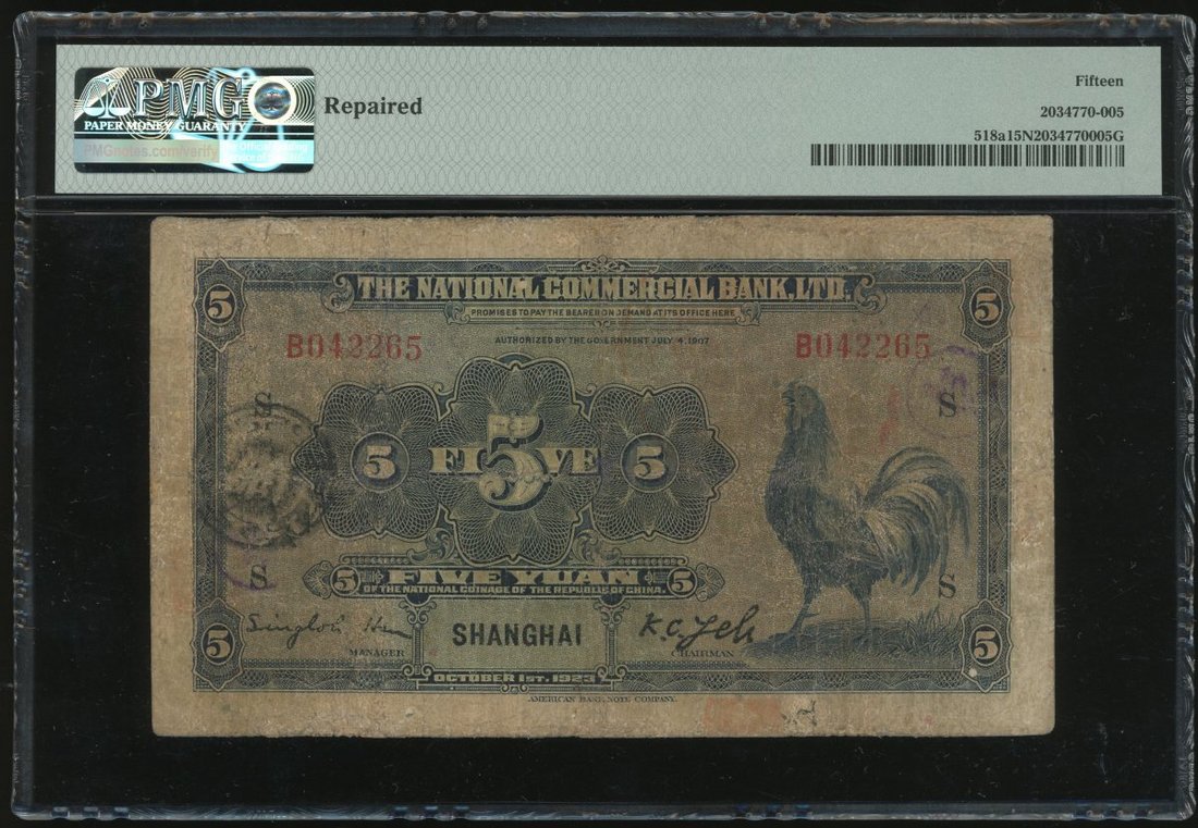 National Commercial Bank, Ltd., $5, 1923, Shanghai, serial number B042265, red on light green underprint, reverse green, rooster at right,