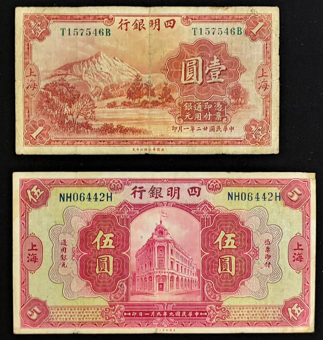 四明銀行紙幣2枚一組,包括民國二十二年(1933)壹圓,上海地名,編號T157546B,及民國九年(1920)伍圓,上海地名,編號NH06442H,AF及VF
