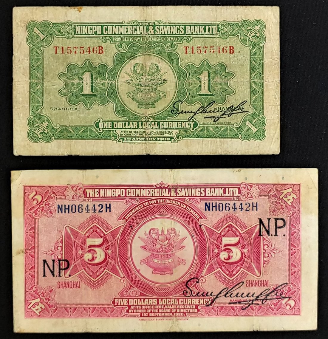 The Ningpo Commercial and Savings Bank Limited, lot of 2 notes consisting of: 1 yuan, Shanghai, 1933, # T157546B and 5 yuan, Shanghai, 1920, #NH06442H,