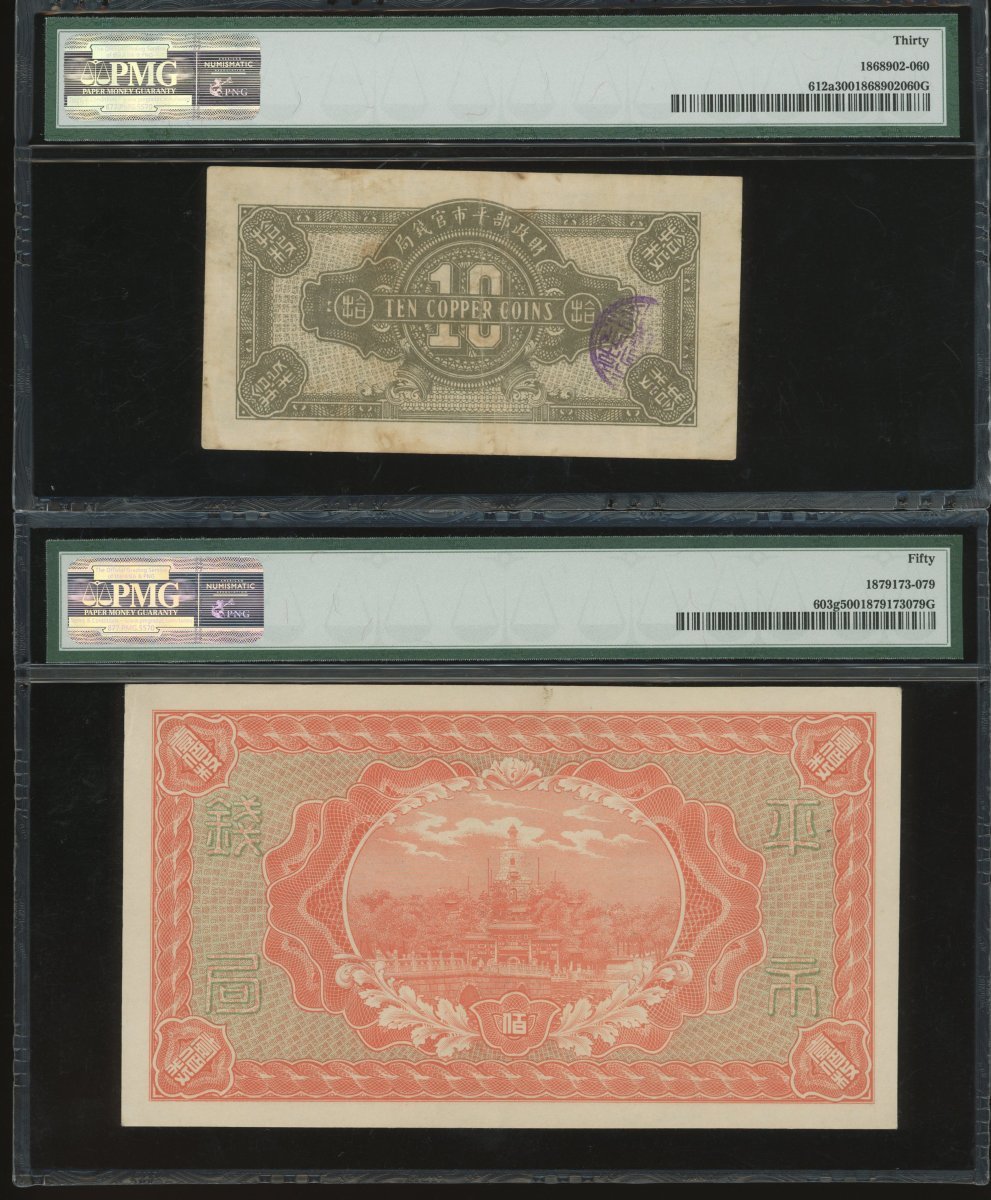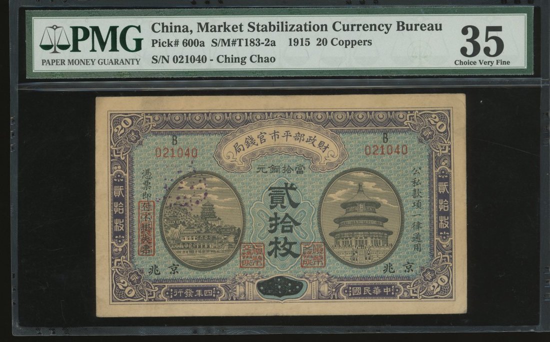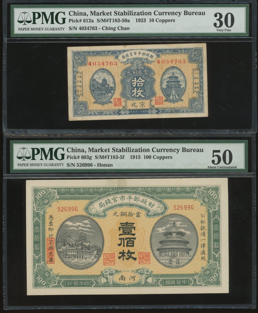 Market Stabilization Currency Bureau, a group of 5x notes, consists of 10 coppers, 20 coppers (2), 50 coppers and 100 coppers, Ching Chao, Honan and Heilungkiang, Year 4(1915) and Year 12(1923), serial numbers 4034763, 0002067, 021040, 783747 and 526996, (Pick 612a, 600a, 603g, 602c and 614a), graded PMG 30, 35, 50, 55 and 20 respectively (5).