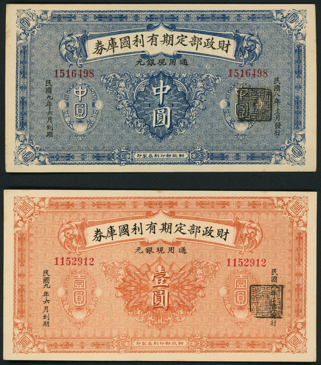 Fixed Term, Interest Bearing Treasury Notes, a pair of 1/2 yuan and 1 yuan, December 1919, (Pick 626a, 627), almost uncirculated, minor crease and foxing (2)