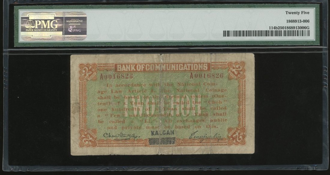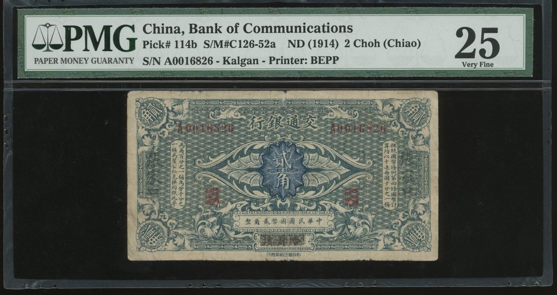 Bank of Communciations, 2 choh, Kalgan over Harbin, ND(1914), serial number A0016826, (Pick 114b), PMG 25 Very Fine