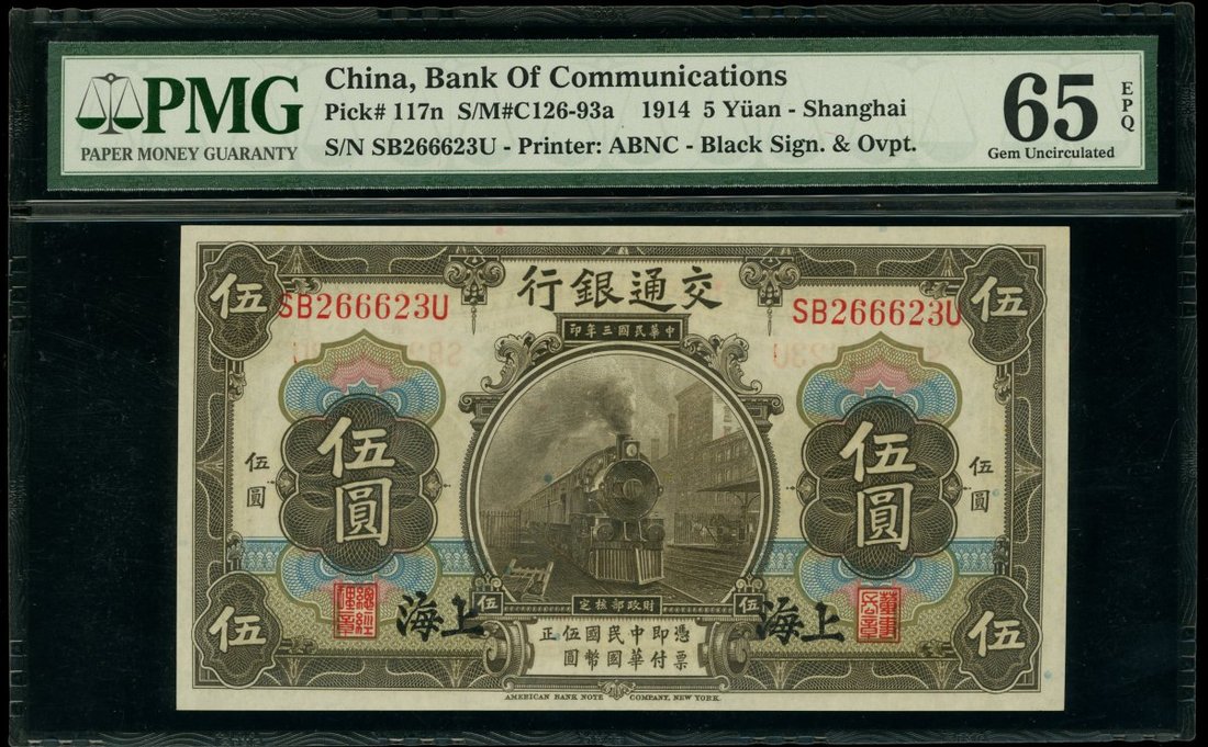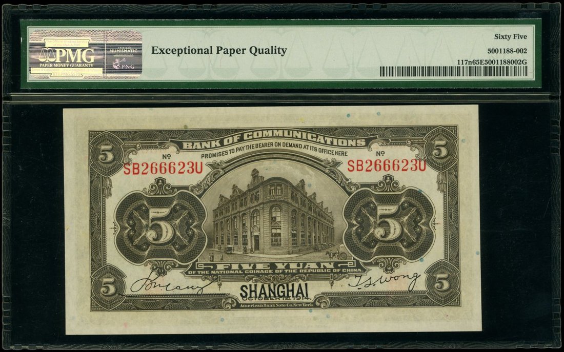 Bank of Communications, 5 yuan, Shanghai, 1914, serial number SB266623U, (Pick 117n), PMG 65EPQ Gem Uncirculated