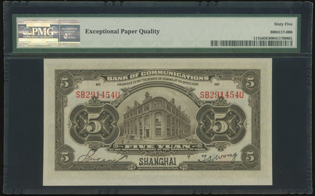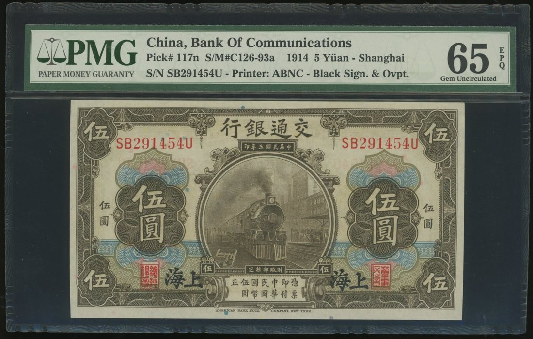 Bank of Communications, 5 yuan, 1914, Shanghai, serial number SB291454U, (Pick 117n), PMG 65EPQ, gem uncirculated.