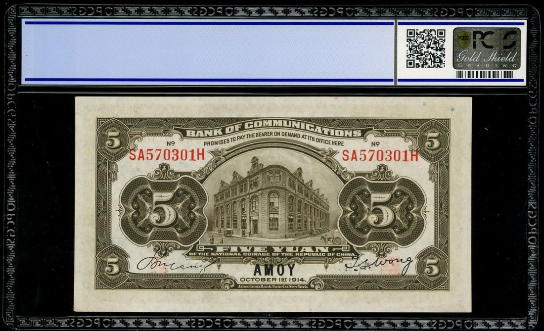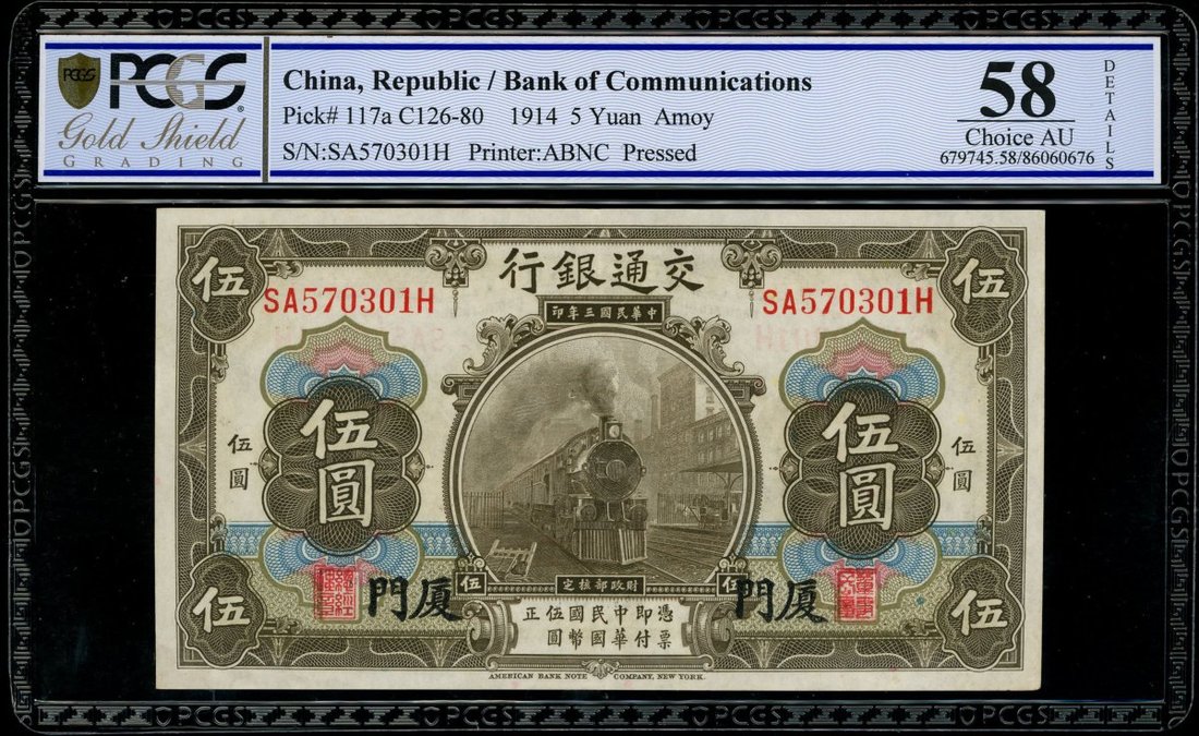 Bank of Communciations, 5 yuan, Amoy, Year 3 (1914), serial number SA570301H, (Pick 117a), PCGS Gold Shield Grading 58 Details (Pressed).