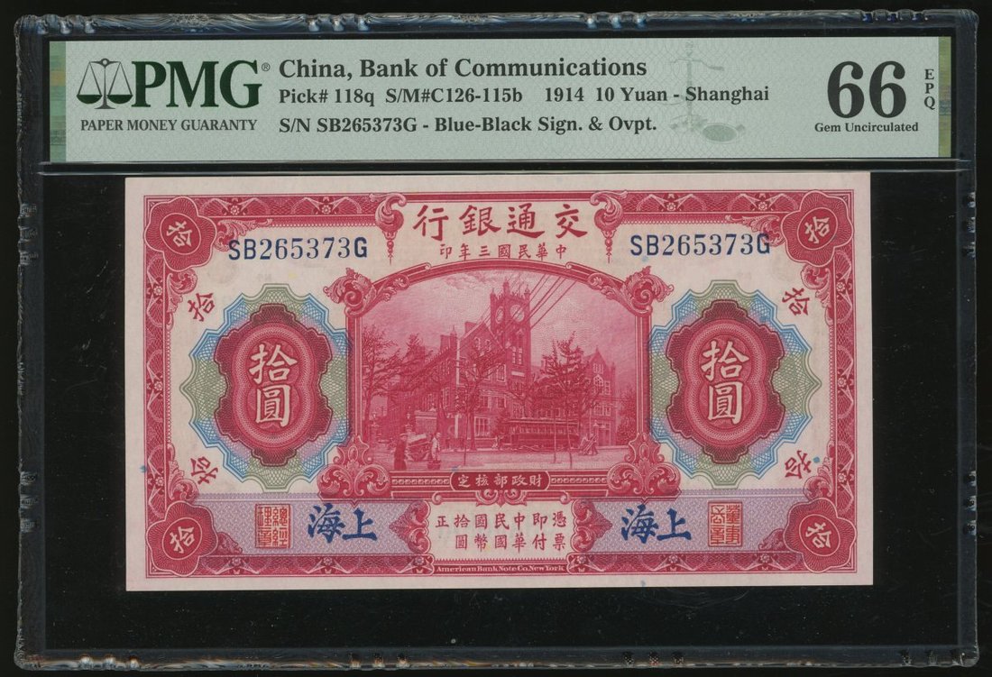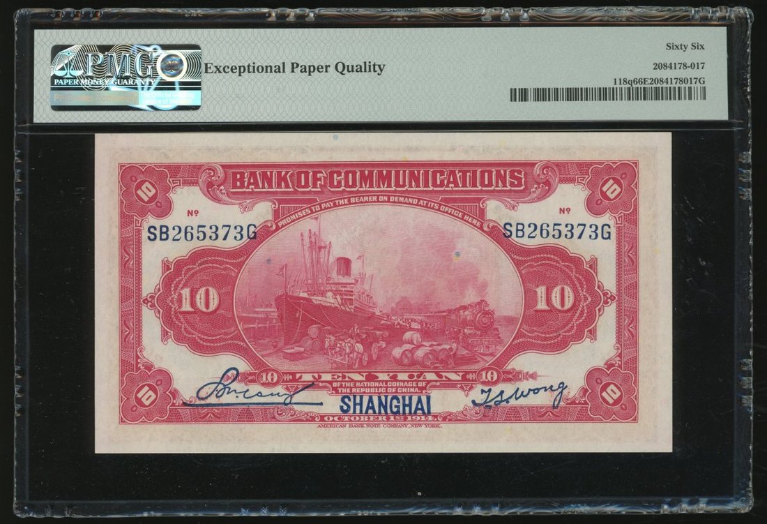 民國三年(1914)交通銀行拾元,上海地名,編號SB265373G,PMG 66EPQ