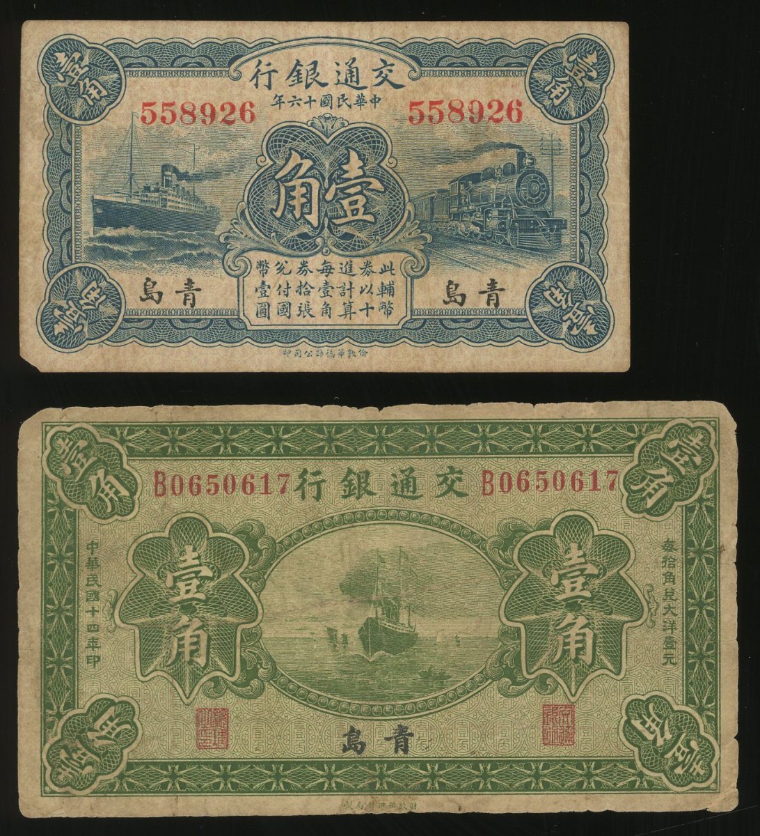1925及27年交通銀行壹角一對,青島地名,編號B0650617及558926,F至VF品相