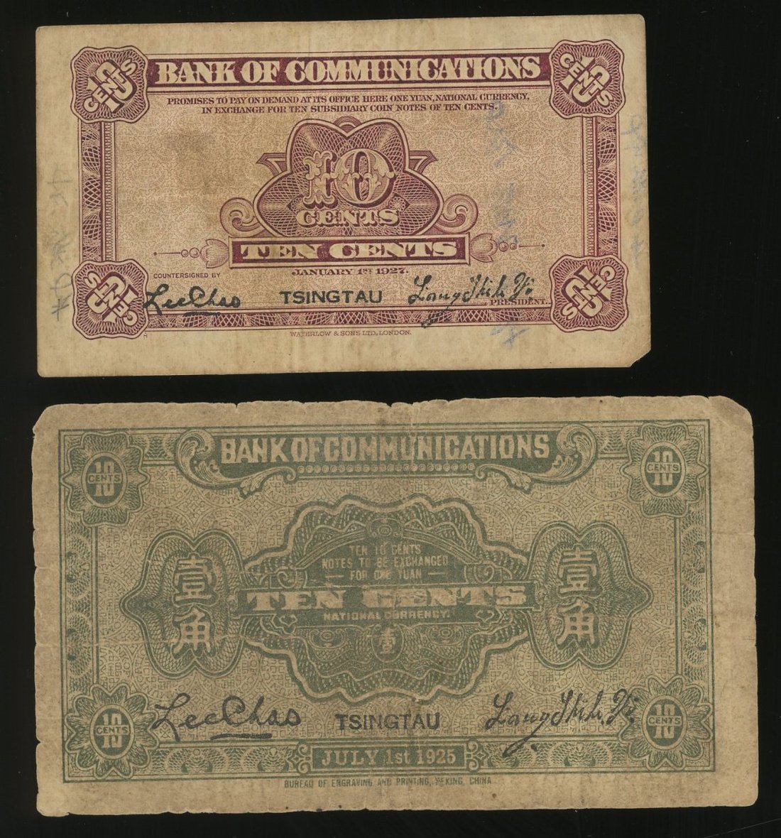 Bank of Communications, a pair of 1 chiao, Tsingtau, 1925 and 1927, serial numbers B0650617 and 558926, (Pick 138c, 141b), fine to very fine (2)