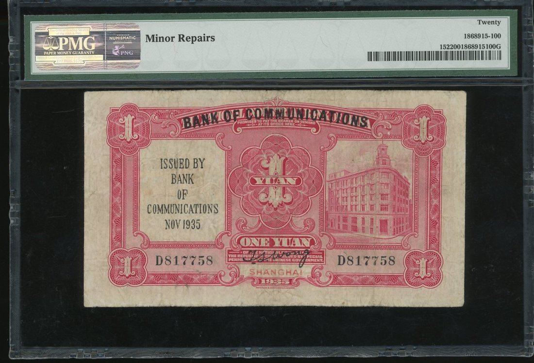 1935年中國實業銀行改交通銀行壹圓,編號D817758,PMG 20,有微修