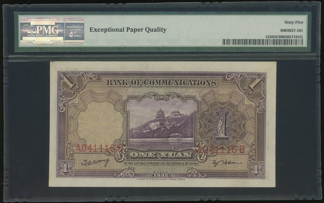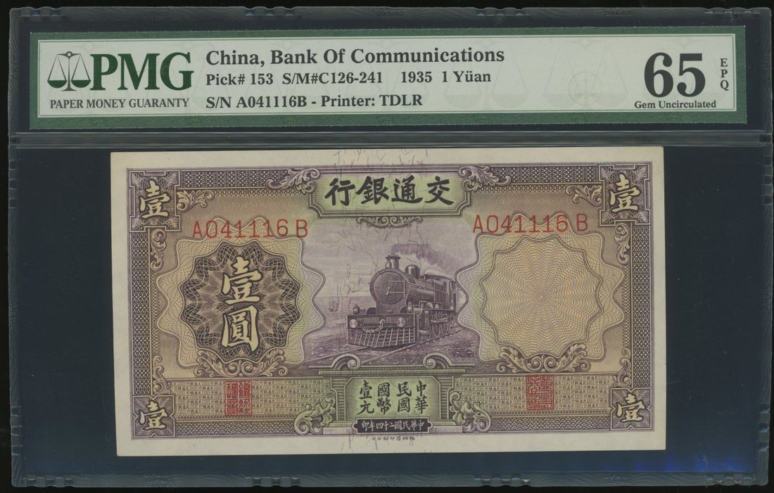 Bank of Communications, 1 yuan, 1935, serial number A041116B, (Pick 153), PMG 65EPQ, gem uncirculated.