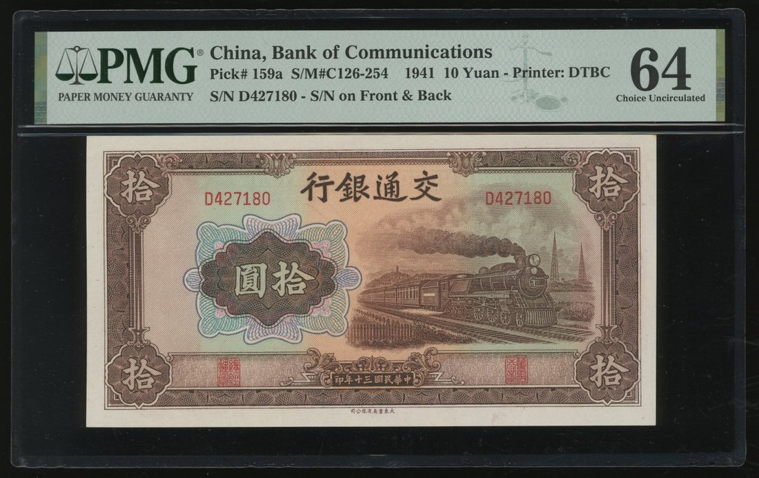Bank of Communications, 10 yuan, 1941, serial number D427180, brown on light green underprint, steam train at right,