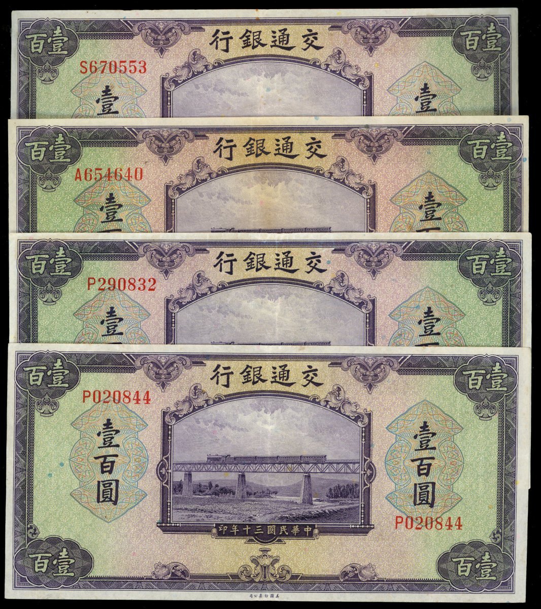 民國三十年(1941)中國銀行壹百圓一組4枚,GVF至EF
