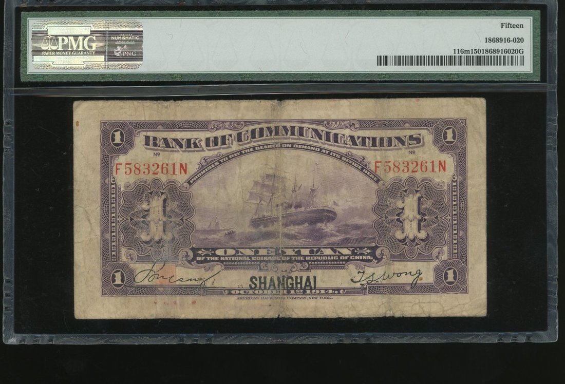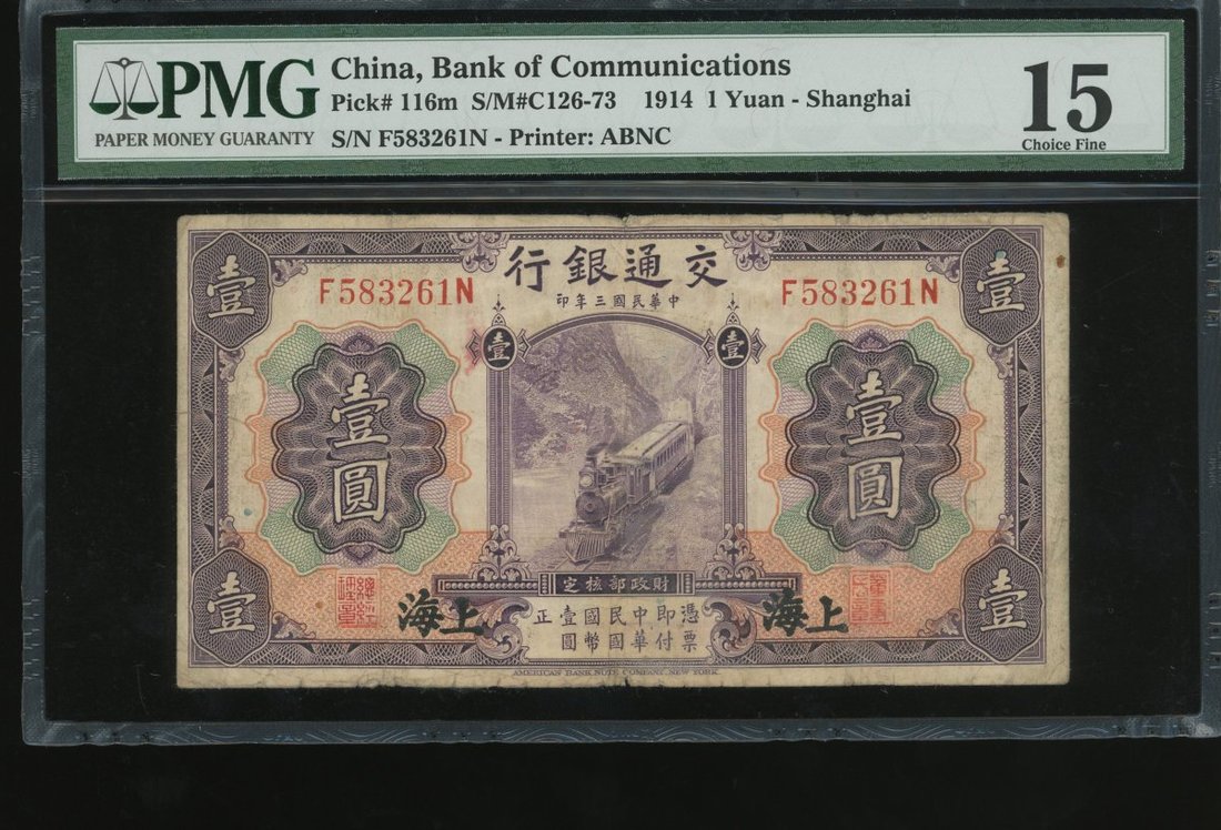 Bank of Communications, 1 yuan, Shanghai, Year 3 (1914), and 100 yuan, Year 31(1942), serial numbers F583261N and B527442, (Pick 116m and 165), graded PMG 15 and 45 reapectively (2).