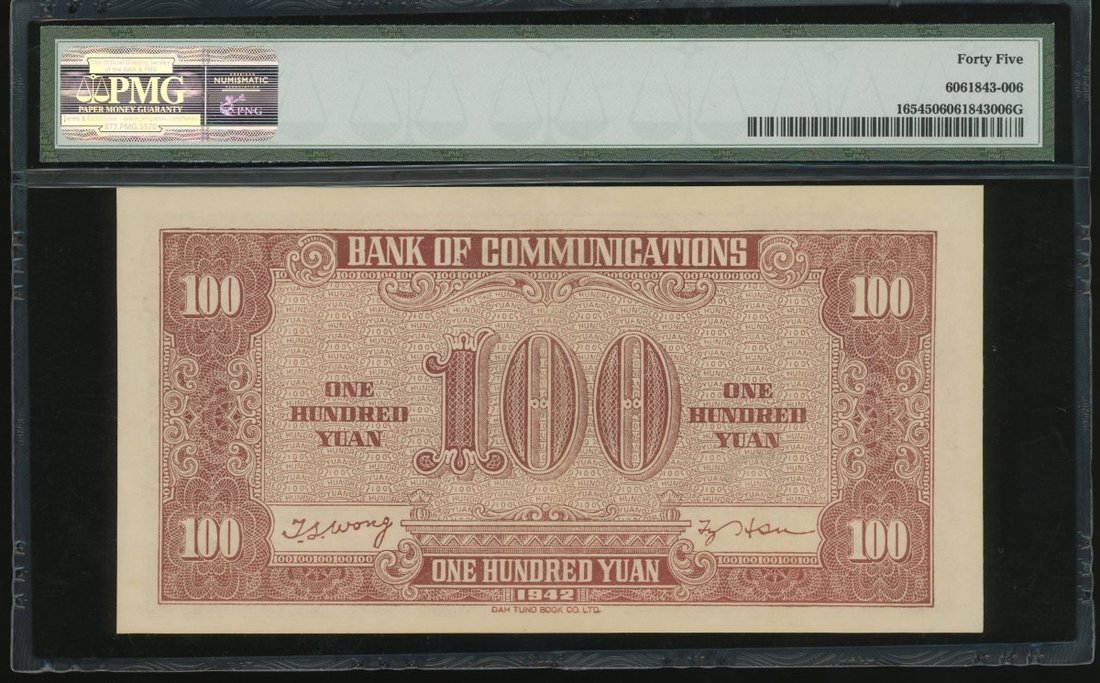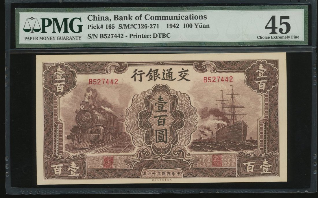 民國三年(1914)交通銀行壹圓,及民國三十一年(1942)壹百圓,編號F583261N 及 B527442,分別評PMG 15及45