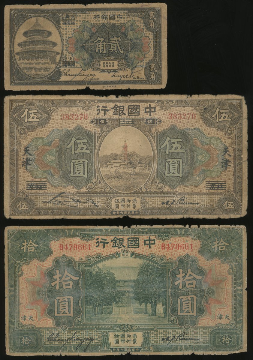 民國七年(1918)中國銀行一組3枚,包括貳毫,上海地名,伍圓,北京改天津,及拾圓,天津地名,編號A999992,383270及B470661,VG至F品相