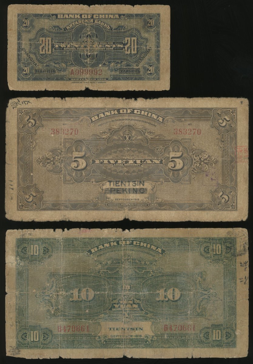Bank of China, 20 cents, Shanghai, 5 Yuan, Tientsin on Peking, and 10 Yuan, Tientsin, 1918, serial numbers A999992, 383270 and B470661,