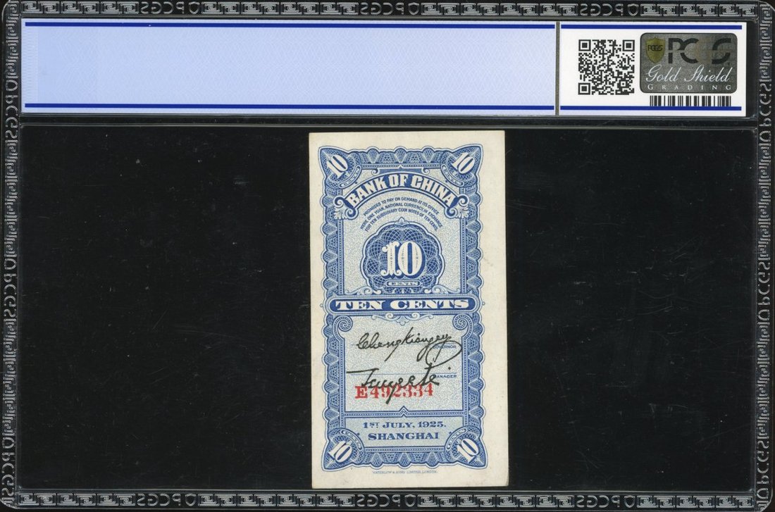 Bank of China, 10 cents, Shanghai, Year 14 (1925), serial number E492334, (Pick 63), PCGS Gold Shield Grading 55 About Uncirculated
