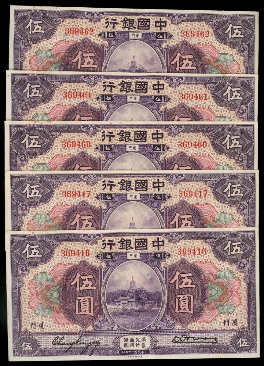 民國十九年(1930)中國銀行伍圓5枚,廈門地名,均GEF,原裝紙,中央有摺