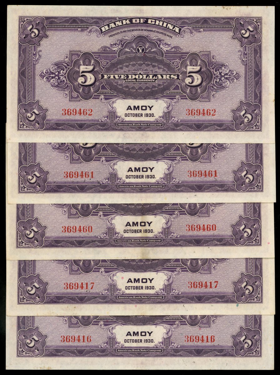Bank of China, a group of 5x 5 yuan, Amoy, Year 19(1930), 2 groups of consecutive serial numbers 369416-17, 369460-62, (Pick 68(1)), all GEF, original notes with centre folds (5).