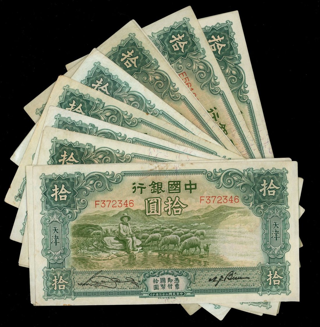 民國二十三年(1934)中國銀行拾圓一組15枚,天津地名,GVF或以上品相