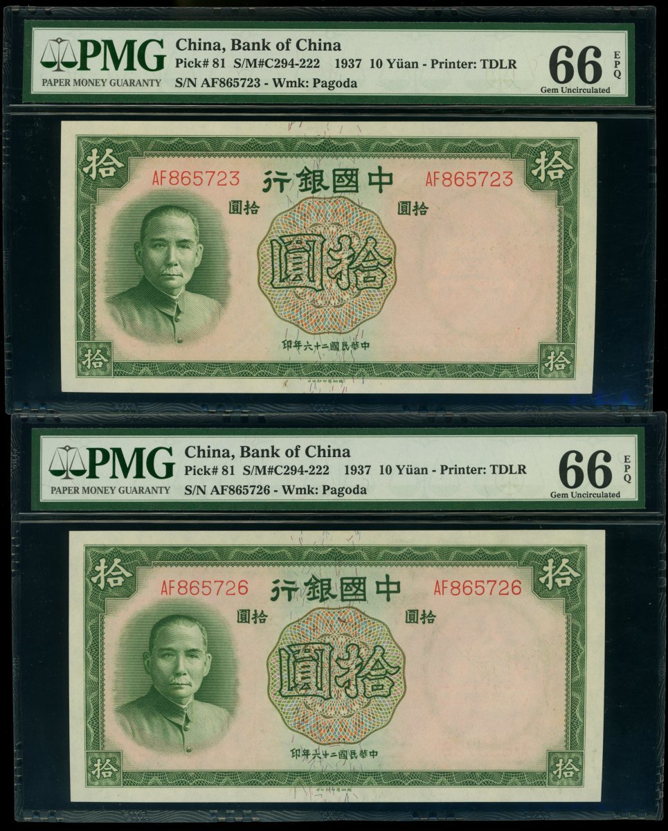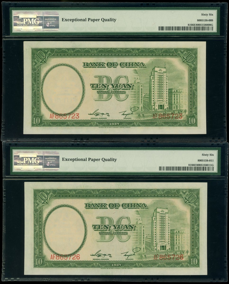 民國二十六年(1937)中國銀行拾圓一對,編號AF865723及AF865726,均PMG 66EPQ