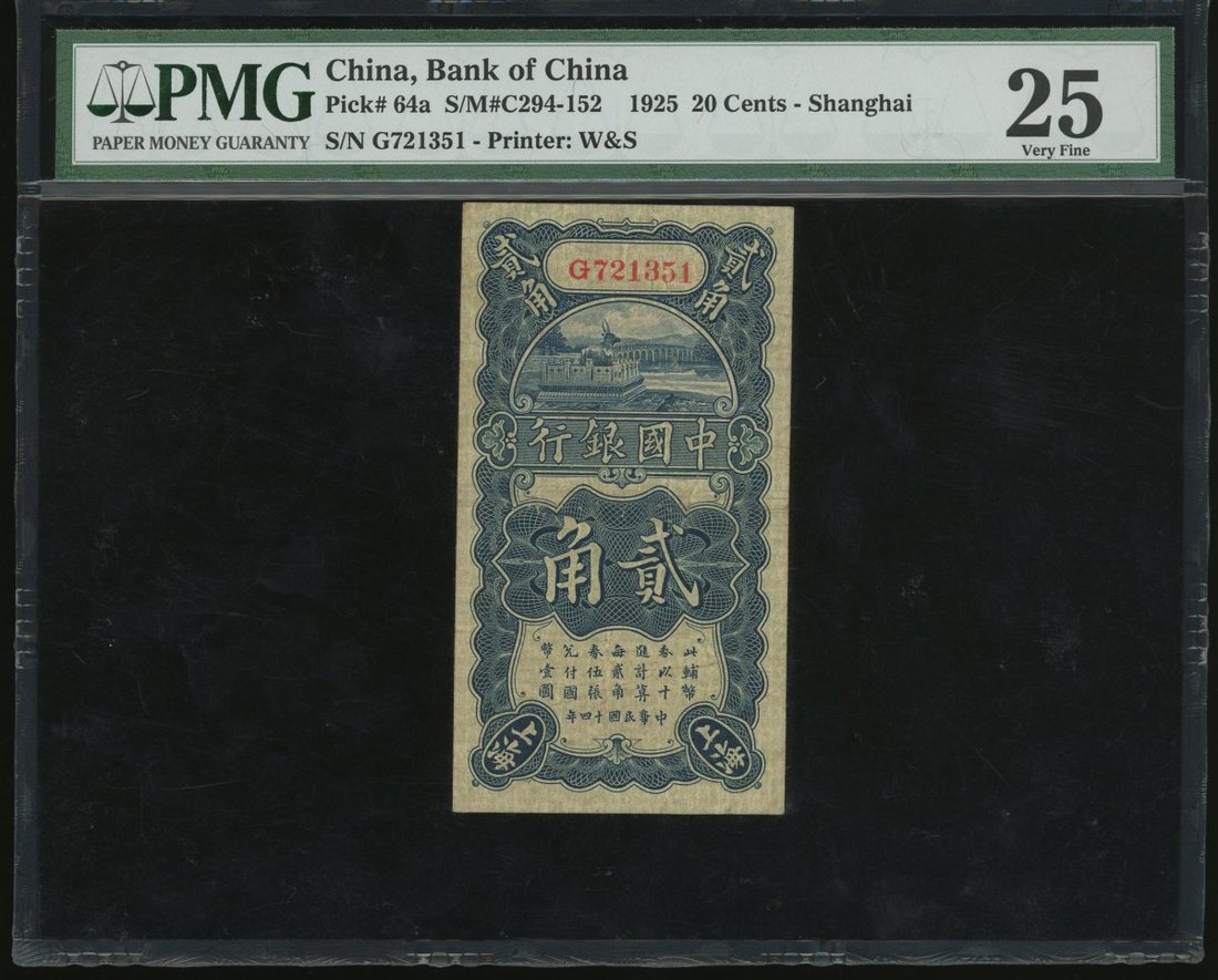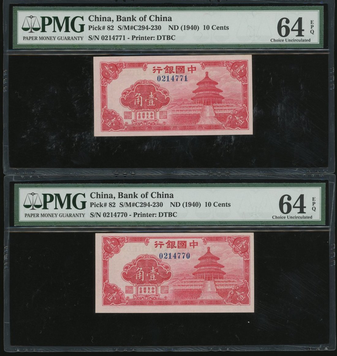 民國二十九年(1940)中國銀行壹角2枚,連號0214770-771,另外1925年貳角,均上海地名,編號G721351,壹角均評PMG 64EPQ,貳角評25