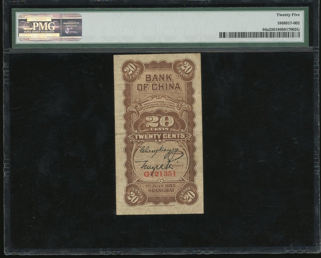 Bank of China, a pair of consecutive 10 cents, ND (1940), and 20 cents, Shanghai, Year 14(1925), serial numbers 0214770-771 and G721351, (Pick 82 and 64a), the 10 cents are graded PMG 64EPQ and 20 cents PMG 25 (3)