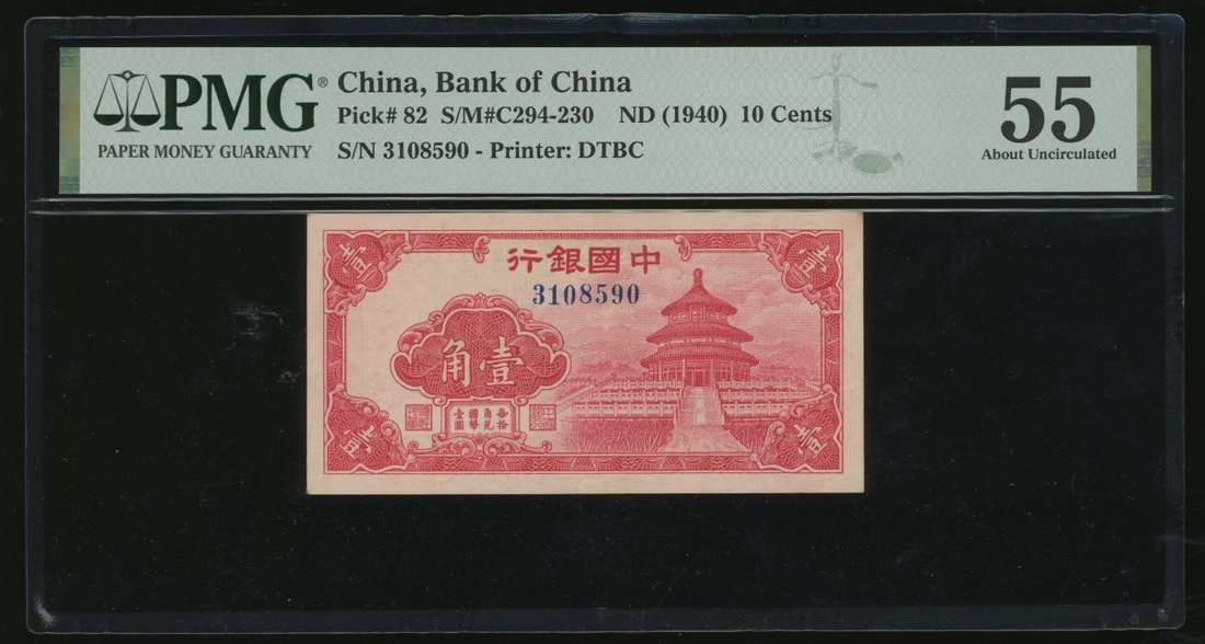 Bank of China, 10 cents, ND(1940), serial number 3108590, red, Temple of Heaven at right,