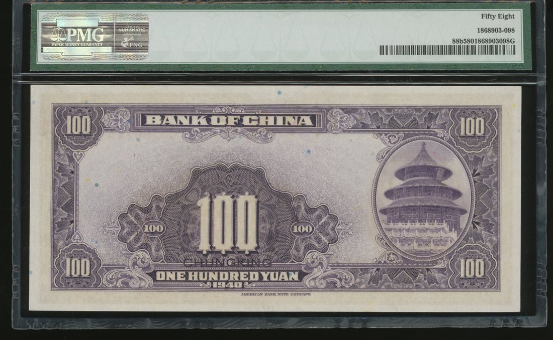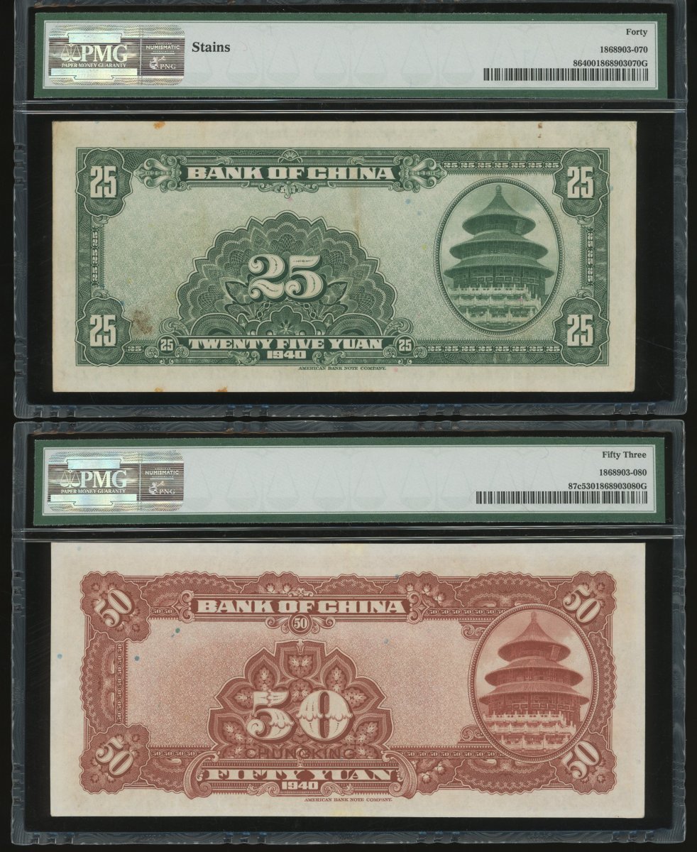 民國二十九年(1940)中國銀行貳拾伍圓、伍拾圓、壹百元一組3枚,後者兩枚為重慶地名,編號J737431,M180910A及C579077A,均PMG 40有漬,53及58(3)
