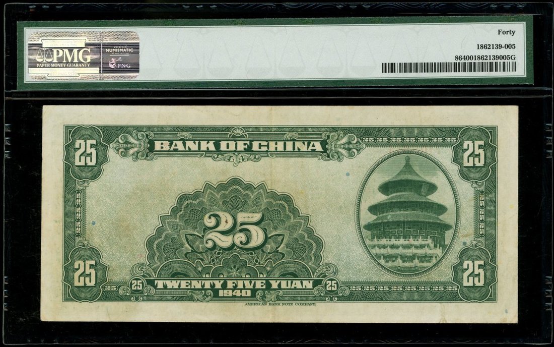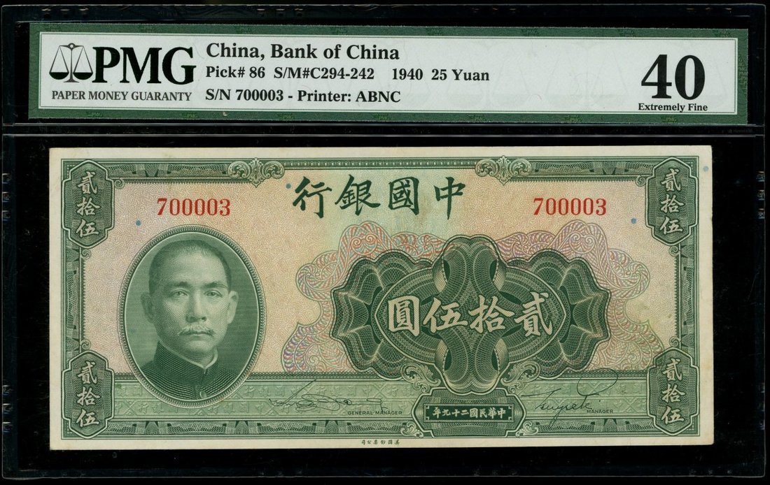 Bank of China, 25 Yuan, 1940, serial number 700003, (Pick 86), PMG 40 Extremely Fine