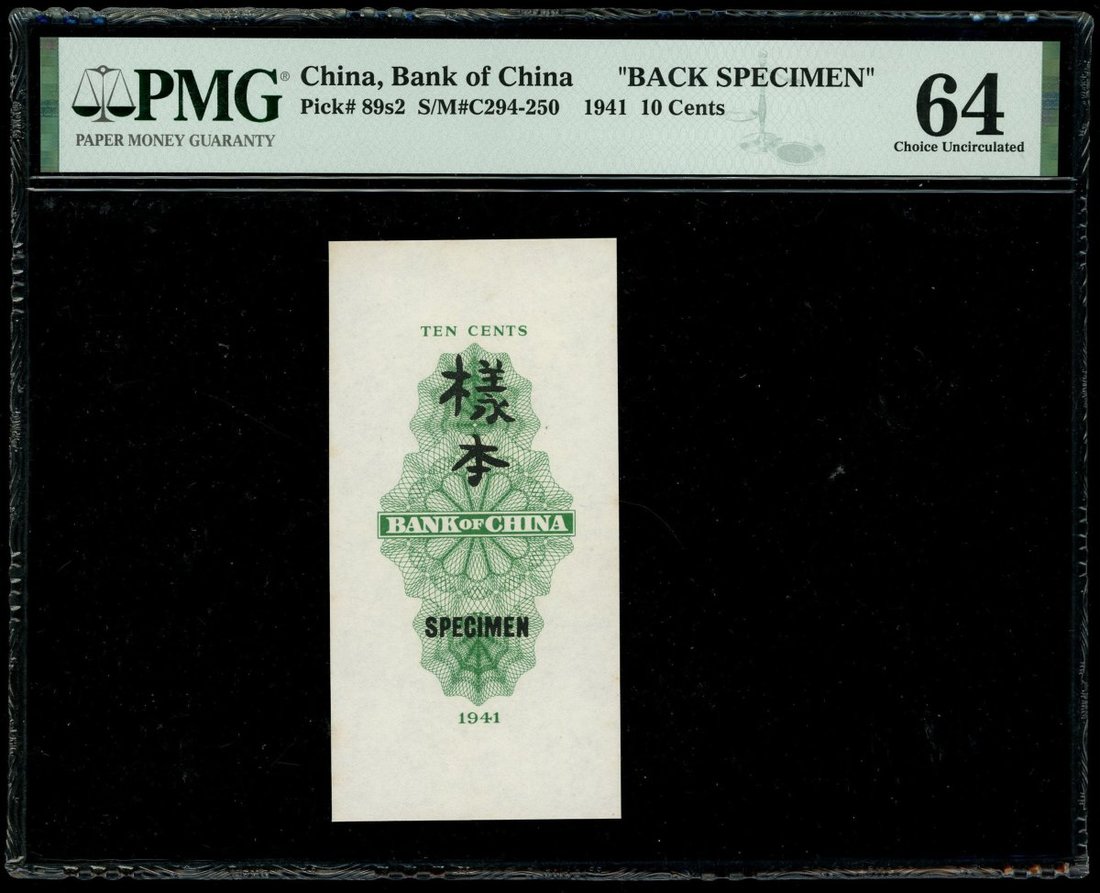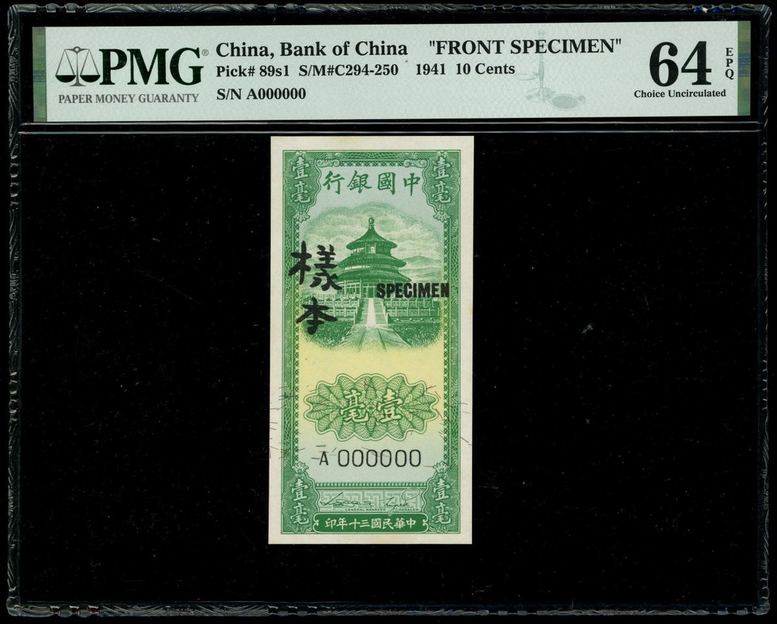 Bank of China, 10 cents, uniface obverse and reverse specimen, 1941, #A000000, (Pick 89s), PMG 64EPQ and 64 (1 pair)