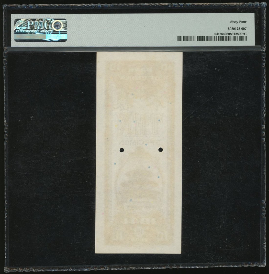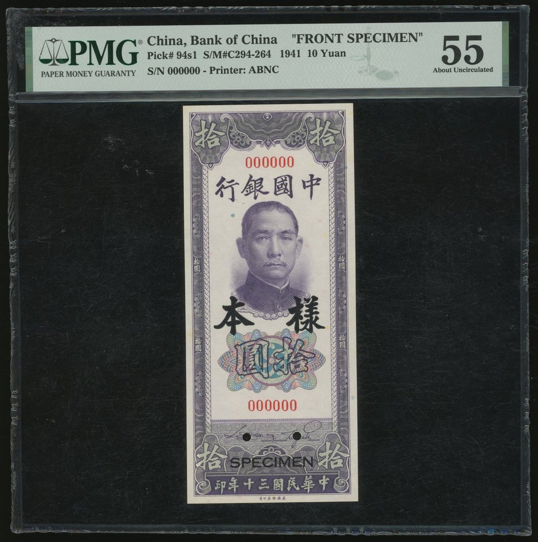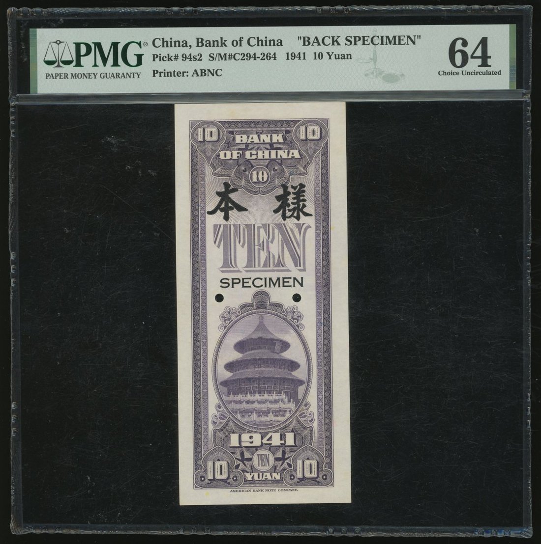 民國三十年(1941)中國銀行拾圓正反面樣票一對,直版,正面評PMG 55,背面評64