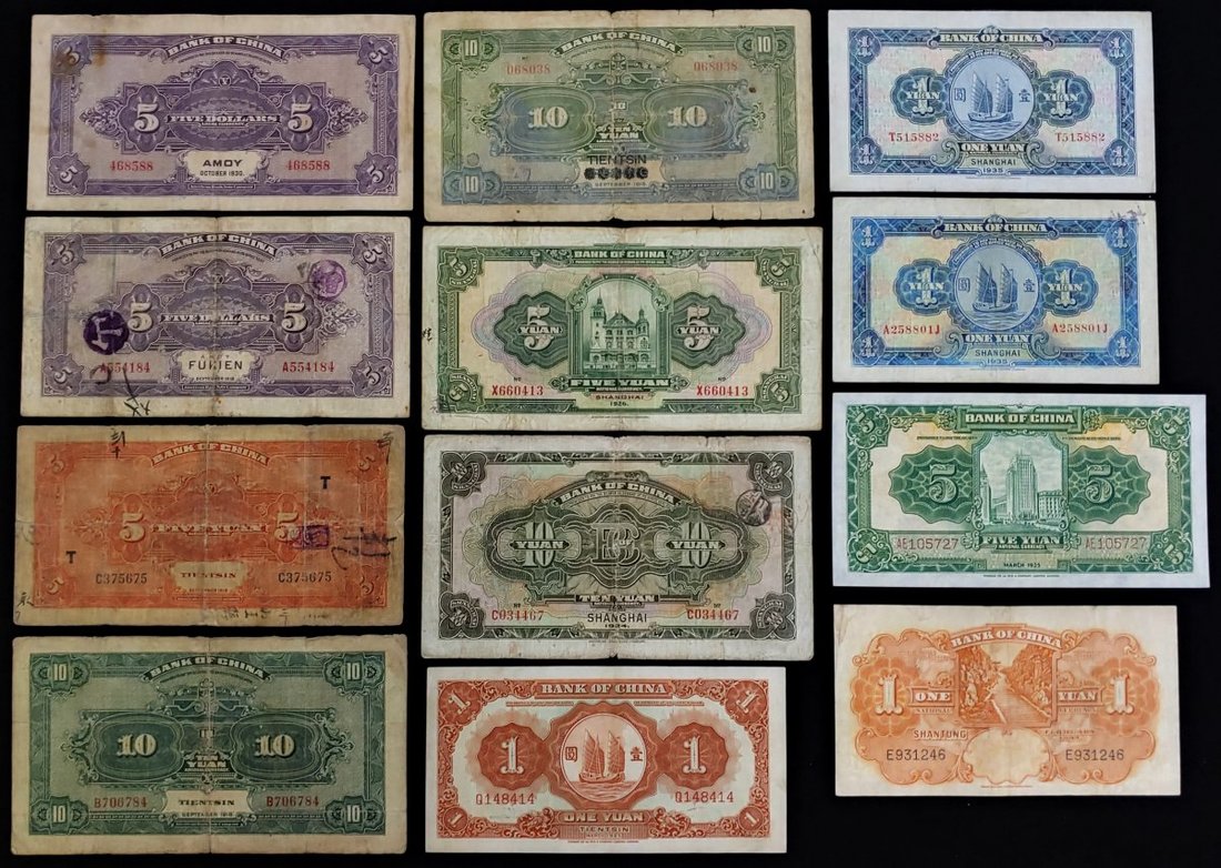 Bank of China, gropu of 18 notes from 1918 to 1940, some better types noted e.g. 5 and 10 yuan from the series of 1918, 1924, 1926 etc,