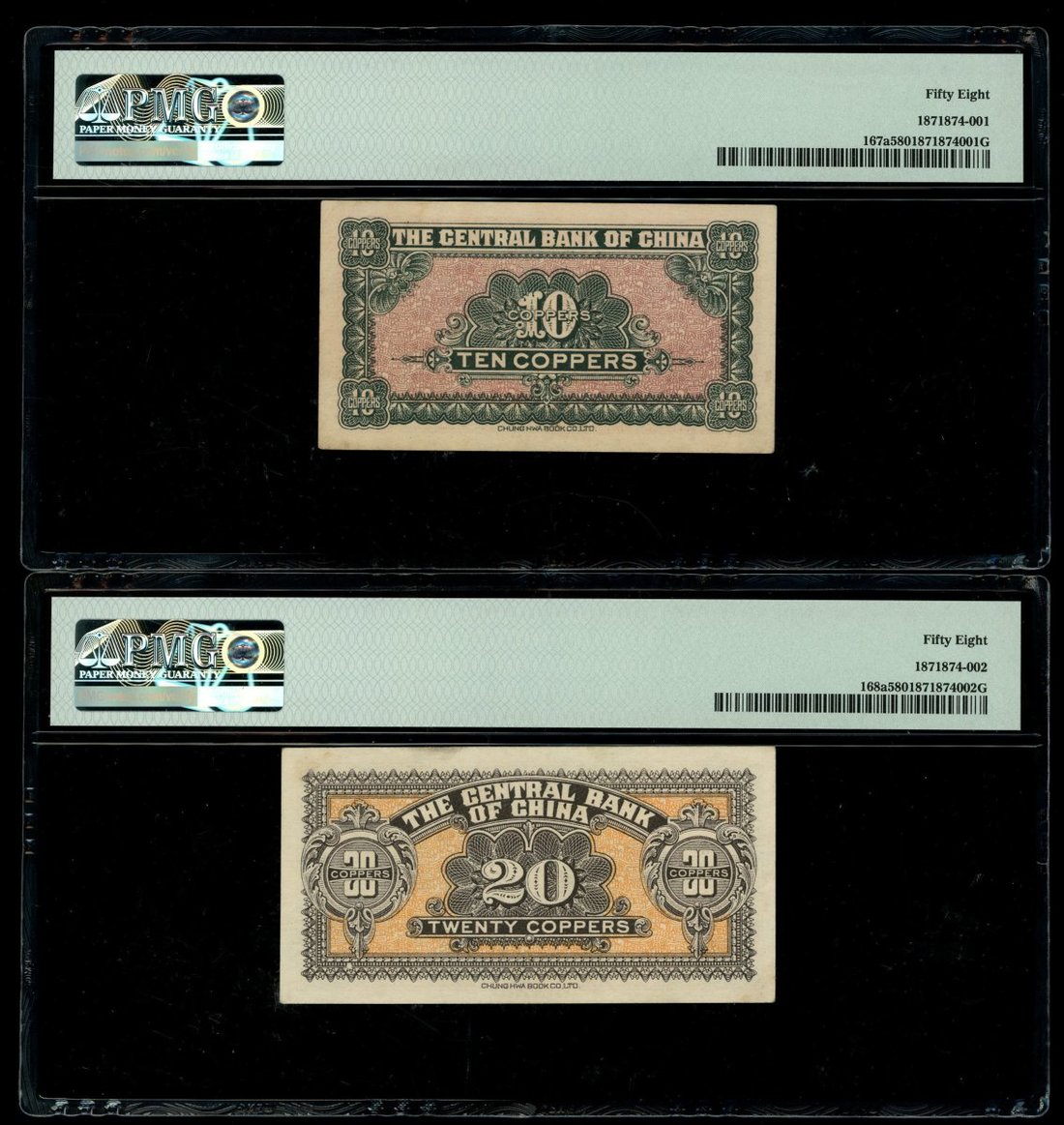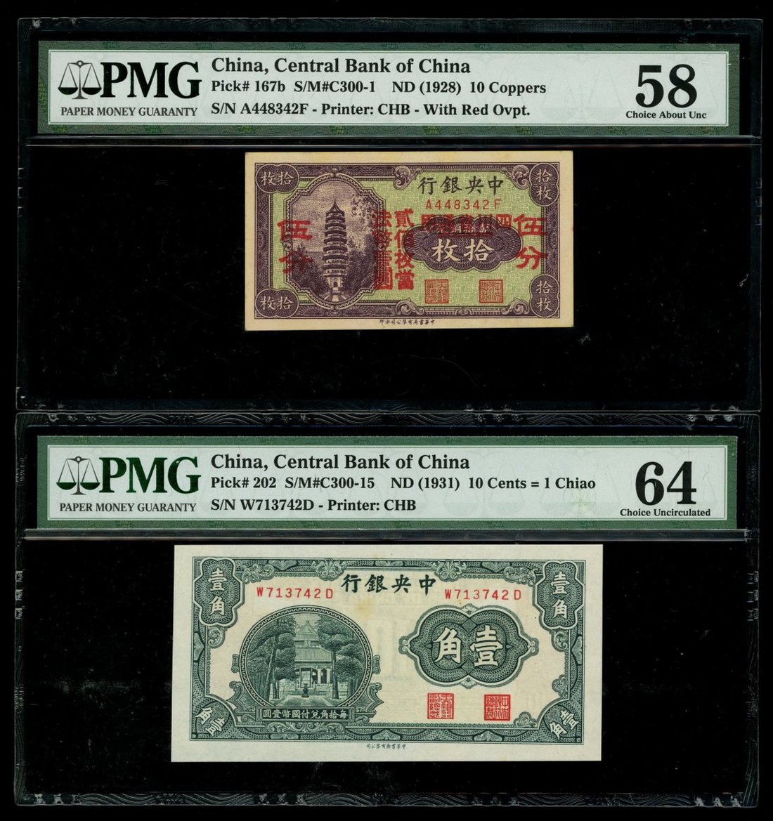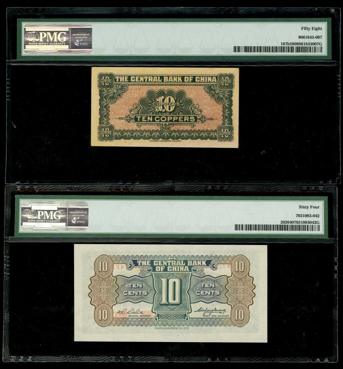 1928至31年中央銀行角分鈔一組4枚,包括當拾銅元拾枚,當拾銅元貳拾枚,限陝省境內通用,U408434及V003605,當拾銅元伍拾枚,四川省通用,及壹角,編號A448342F及W713742D,,首三枚PMG 58,第四枚PMG 64