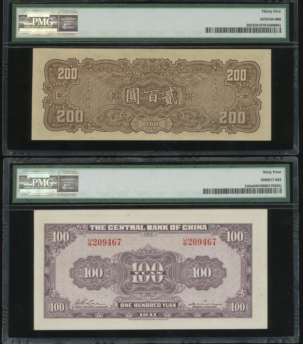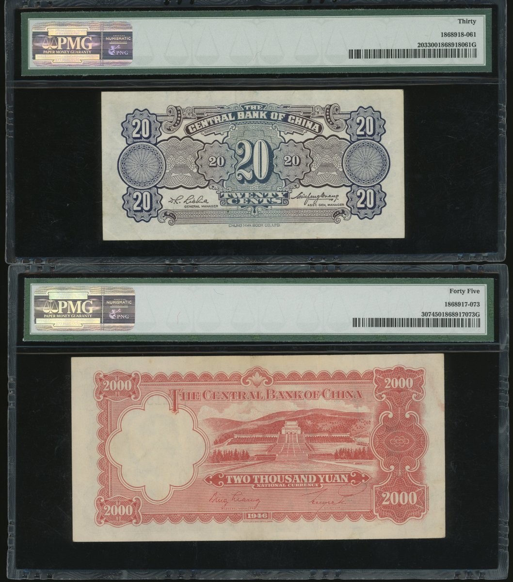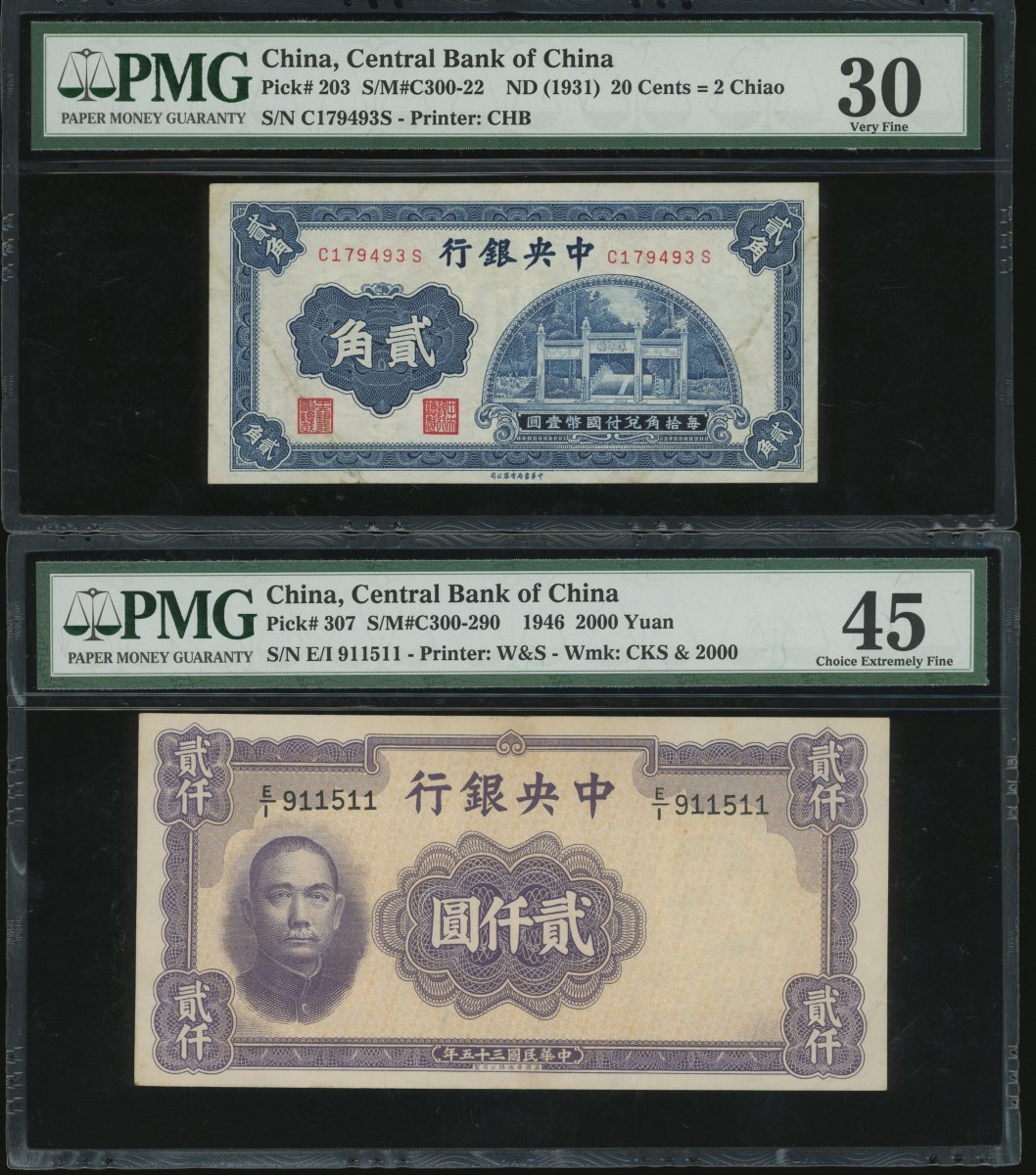 Central Bank of China, a group of 6x notes, consist of 20 cents, 20 yuan, 100 yuan (2), 200 yuan and 2000 yuan, 1931-1946, (Pick 203, 2433a, 262, 307 and 391), all in PMG holder, PMG 30 to 64 (6).