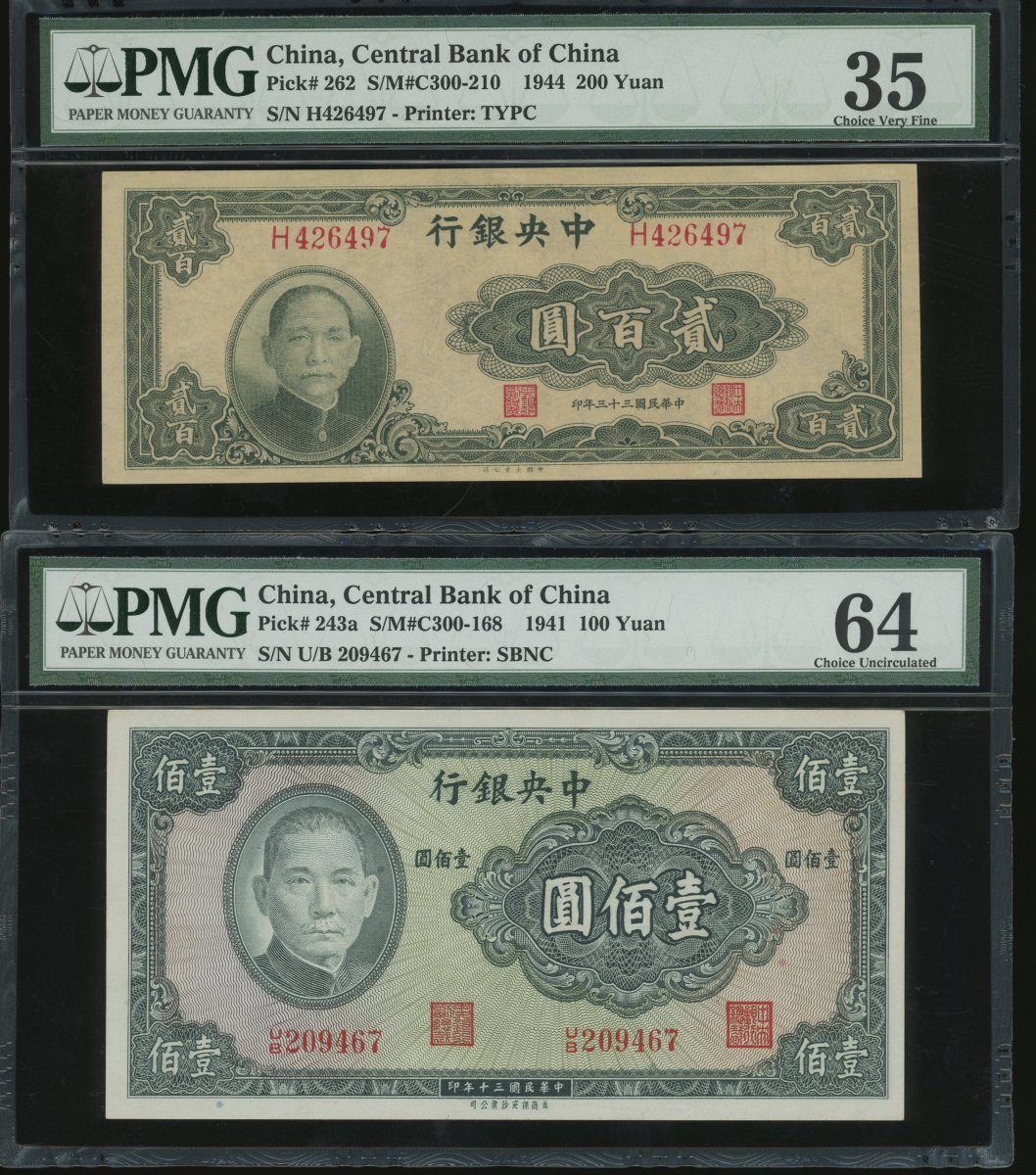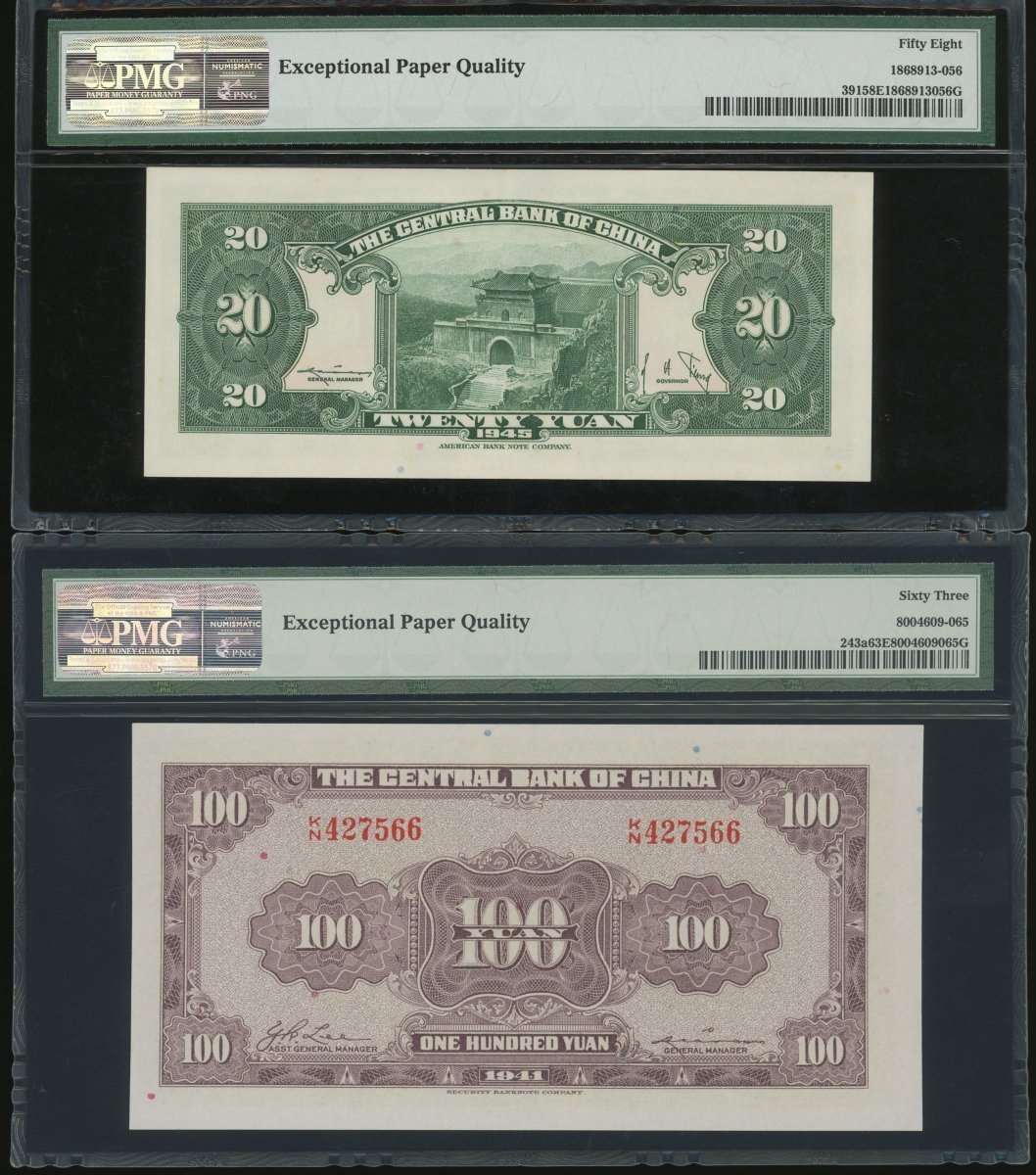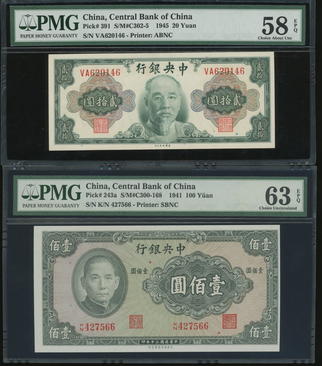 Central Bank of China, a group of 6x notes, consist of 20 cents, 20 yuan, 100 yuan (2), 200 yuan and 2000 yuan, 1931-1946, (Pick 203, 2433a, 262, 307 and 391), all in PMG holder, PMG 30 to 64 (6).