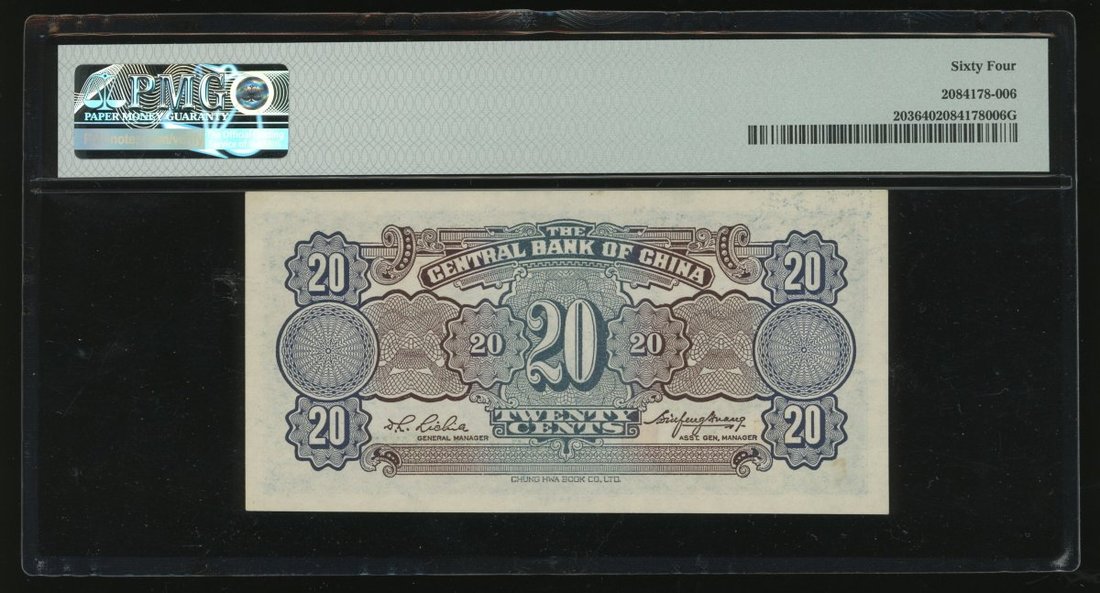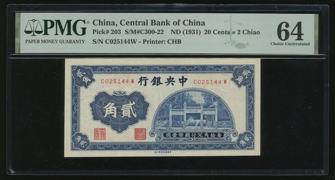 Central Bank of China, 20 cents, ND(1931), serial number C025144W, (Pick 203), PMG 64, choice uncirculated.