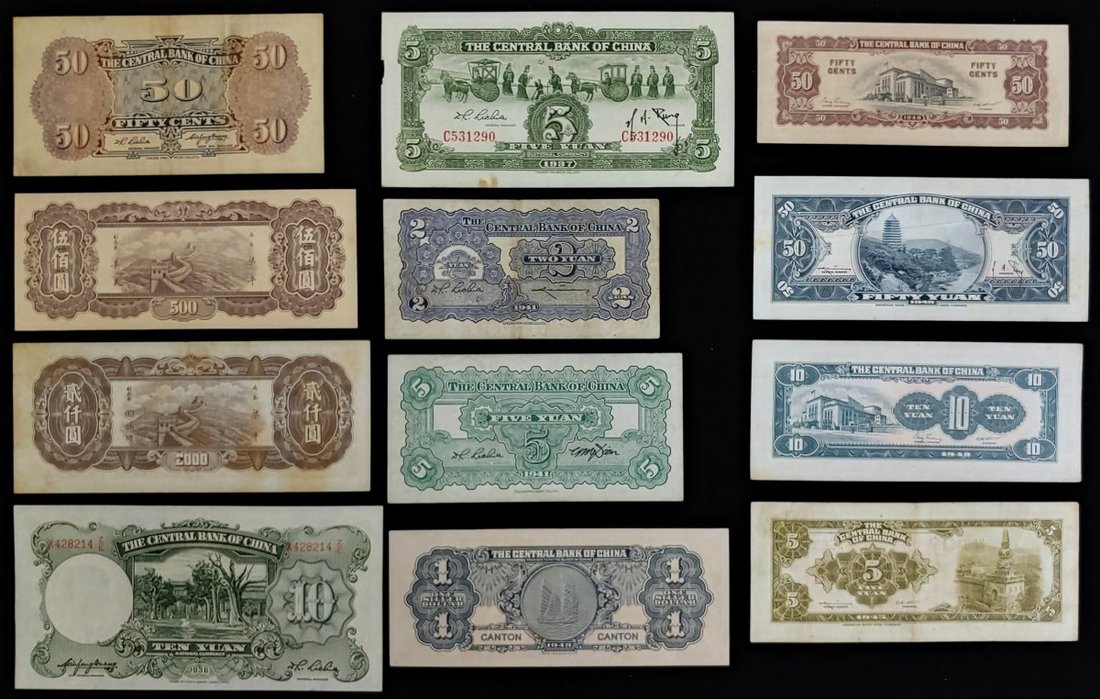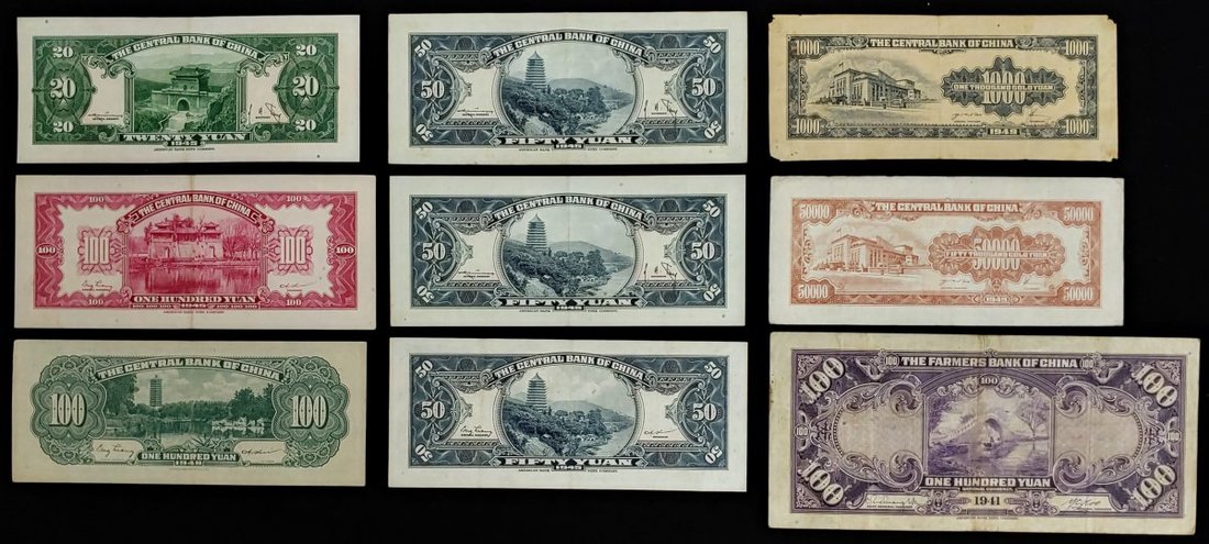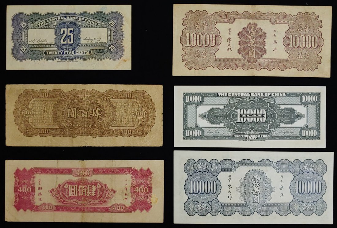 Central Bank of China, group of 32 notes from mainly the 1940's, better notes include the 25 cents of 1931, 5 yuan of 1937 and 400 yuan, of 1944 and 1945, also Farmers Bank of China, 100 yuan, 1941,