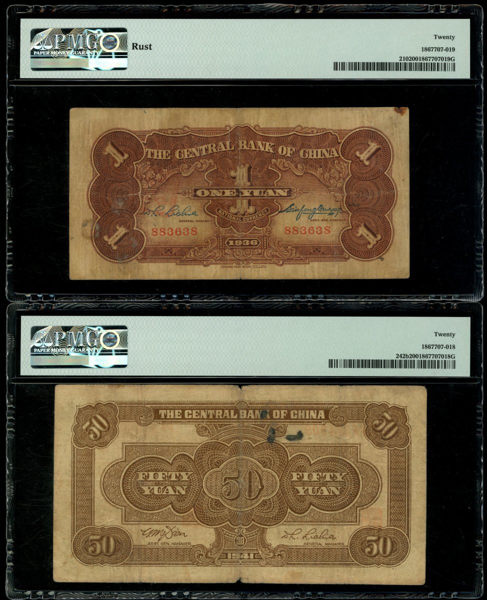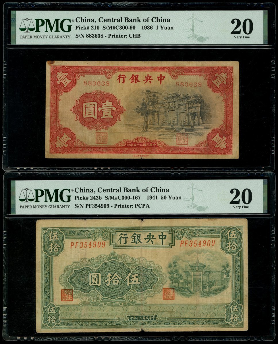 民國二十五年(1936)中央銀行壹圓,及三十年(1941)伍拾圓,編號883638及PF354909,印發自中華書局及福建百城印務局,分別評PMG 20(有銹)及20