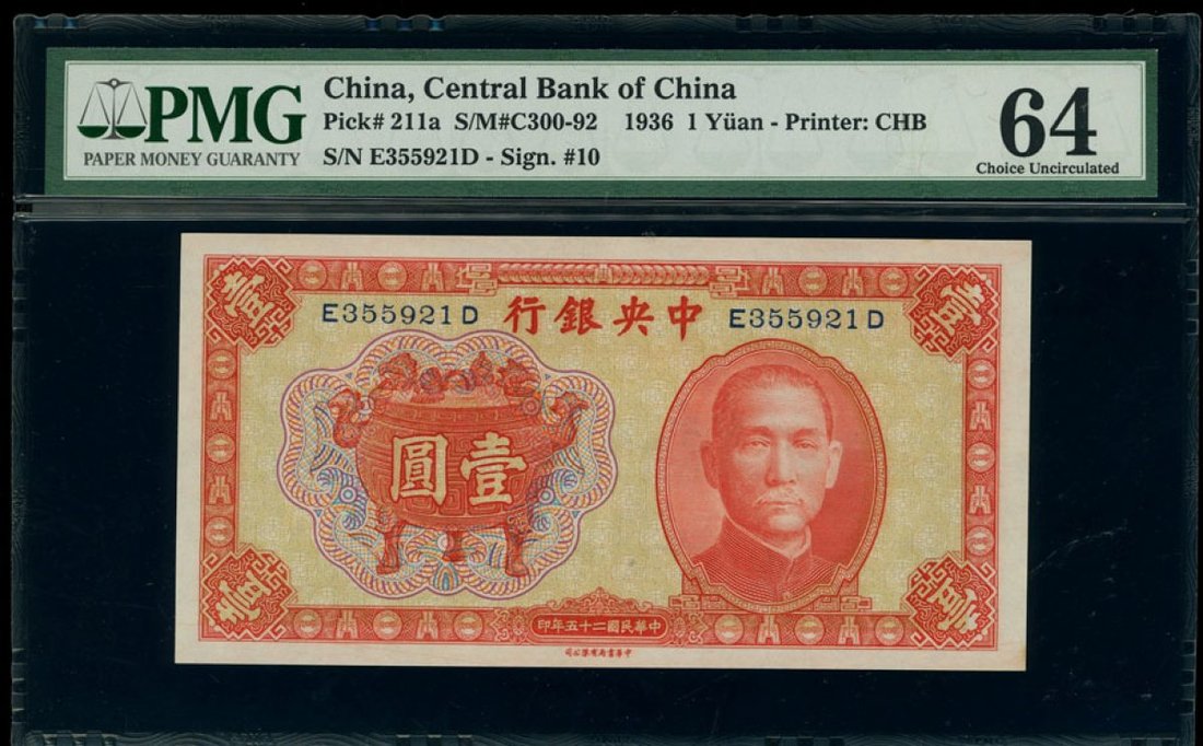 The Central Bank of China, 1 Yuan, 1936, serial number E355921D, (Pick 211a), PMG 64 Choice Uncirculated