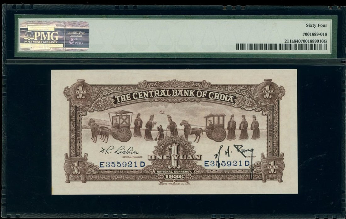 民國二十五年(1936)中央銀行壹圓,編號E355921D,PMG 64